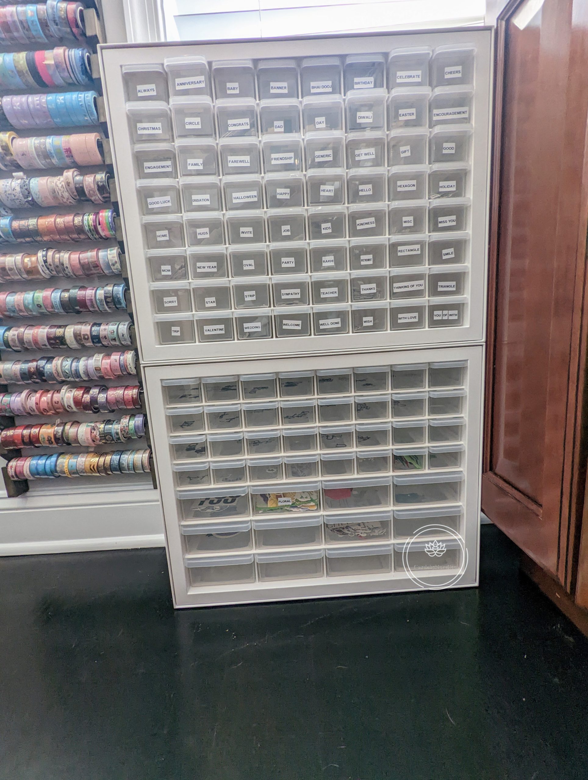 Two of the most useful organizers in my craft room were designed for the garage to hold nuts, bolts, etc. The top one has 64 small drawers and the bottom one has 32 small drawers and 12 medium drawers. These types of organizers come in all different configurations, but this works out well for sentiments and die-cuts. I separate unused sentiments by occasion/phrase into the top one. The bottom organizer holds any extra letters/numbers as well as larger die cuts. Then whenever I’m creating something, I can easily pull out the relevant drawer and have a bunch of sentiments or die-cut focal images ready to go. Everything is labeled so I can quickly find what I need and not waste time.
