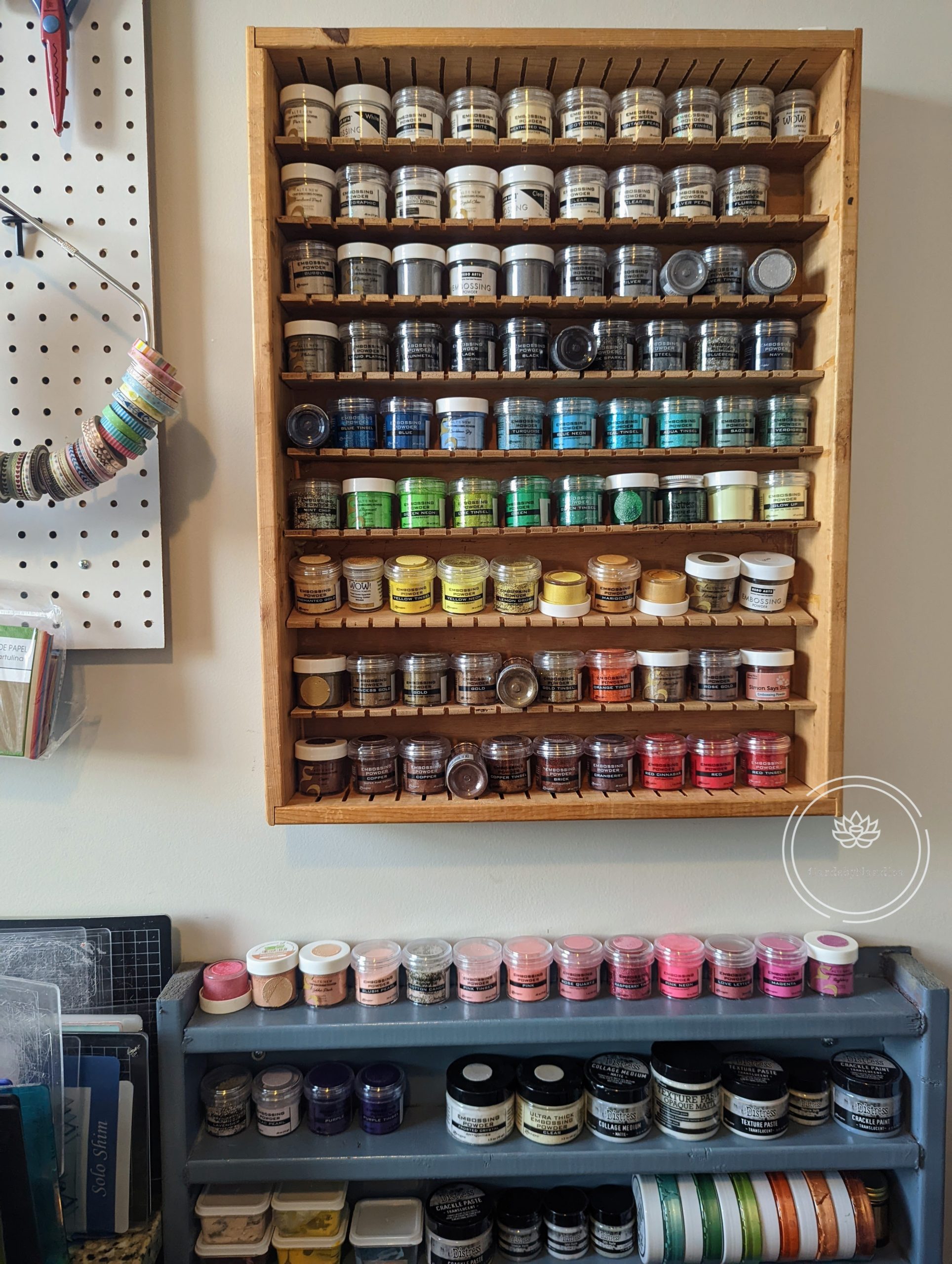 My embossing powders/glitters (and 1 glaze!) used to all be on the wall rack. Originally this was a cassette tape organizer that my Mom very kindly changed to hold my embossing powders. As I’ve added more colors and types of embossing powder, I’ve had to start keeping some on my blue shelf. The blue shelf was fully custom built by my amazingly talented Mom about 7 years ago. This holds my various texture mediums (mostly used with stencils) as well as my Tonic Nuvo Sequins and Confetti (for shaker cards).
