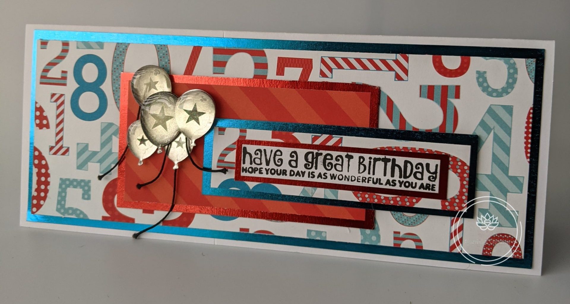 The first birthday card of the year was for my brother-in-law. I wanted to try out new techniques, so I made an interactive card, with flaps that opened to a different image. I couldn’t find my Party Panda Lawn Fawn set, but a very sweet member of one of the LF facebook groups very kindly sent me a bunch of die cuts.