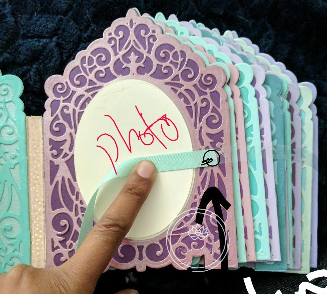 Once I started receiving messages and photos from all of our family, I realized there were so many cute photos that I wanted more space. To increase how many photos I could put in the mini album, I used an APG die of the month – Elegant Swivel & Sashay Card – to make fold-out photo strips. I find the APG dies of the month with interactive elements to be useful for papercraft projects. For a few of the pages, I added trifold oval panels so I could include even more photos. For all of these panels and strips, I used the same PTI Vintage Cream cardstock.