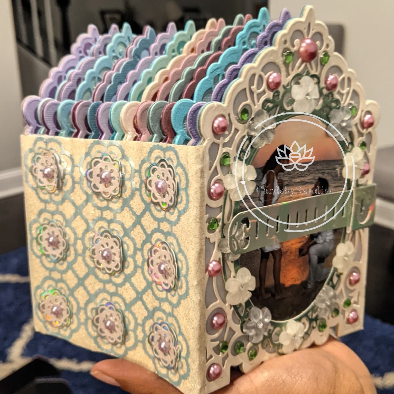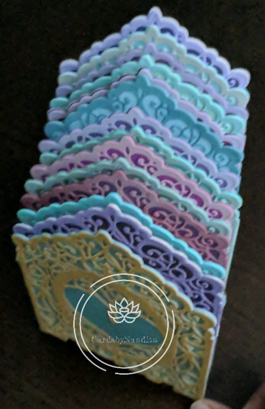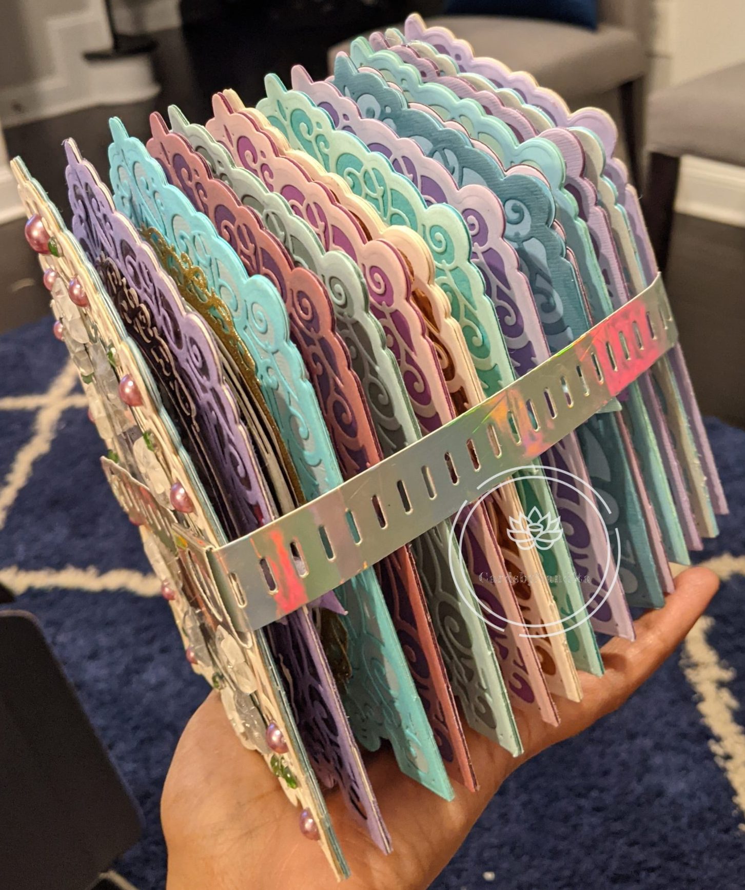 I used Spellbinders’ 3D Vignettes Mini Album die to cut a background page in each cardstock color. I cut the detail layering panel in each of the specialty cardstocks. Finally, I laid them all out – mixing and matching – to find the combination of colors that worked best. I tried to have no more than two pages identical.