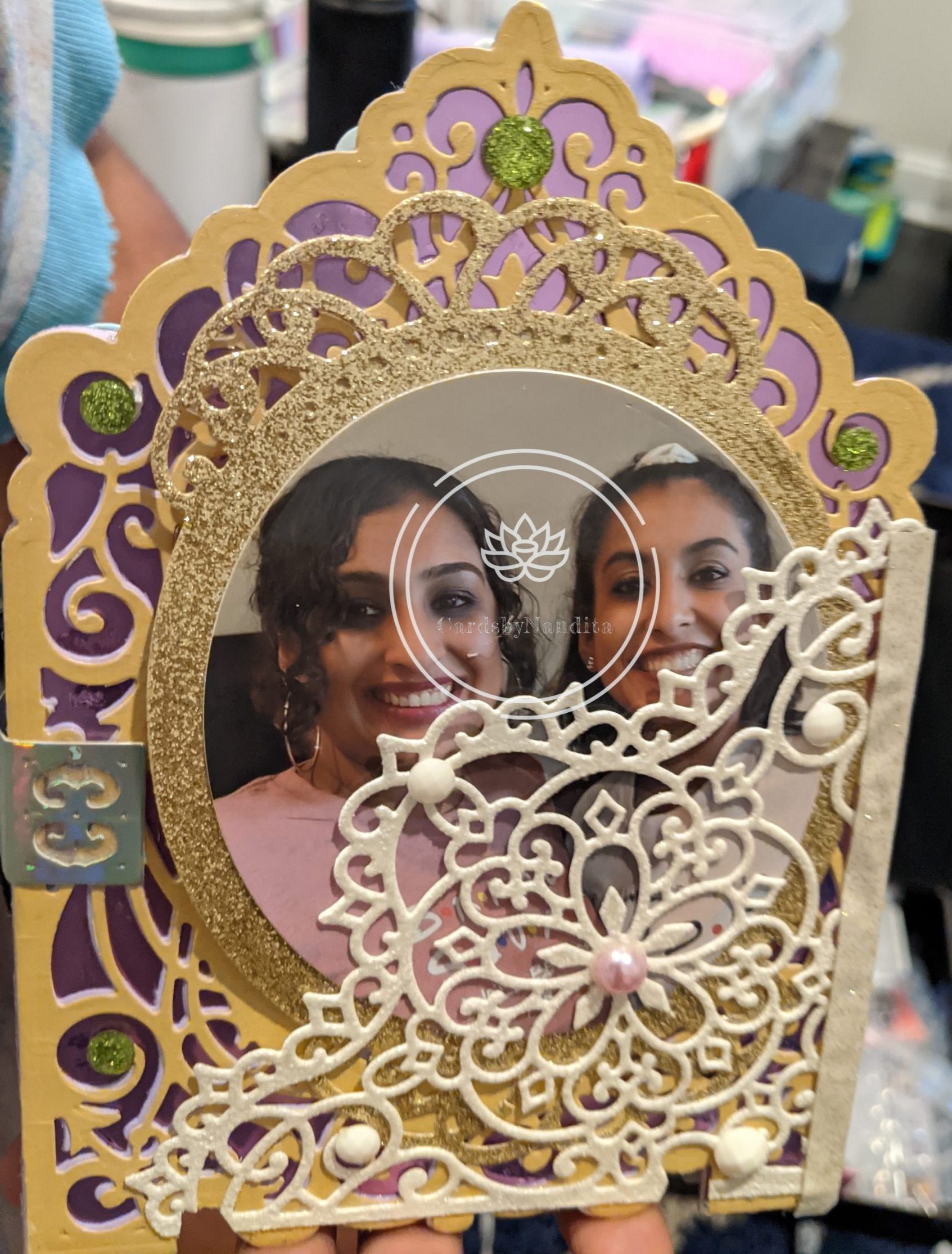 On the back cover, I used Heartfelt Creations’ Decorative Blossom Corner die to create a place where I could have an insert with my logo (plus an extra photo). I also embellished with flat-back pearls, gem stickers, and rhinestones. The corner pocket I cut out of shimmer cardstock but it wasn’t flashy enough for my taste. So I used Versamark Embossing ink to cover the entire panel and then heat embossed in Ranger’s Bridal Tinsel embossing powder. I wish this embossing powder came in the large jar – I go through so much of it! I cut the panel for my logo from gold glitter cardstock with Spellbinders Oval Coronet die.