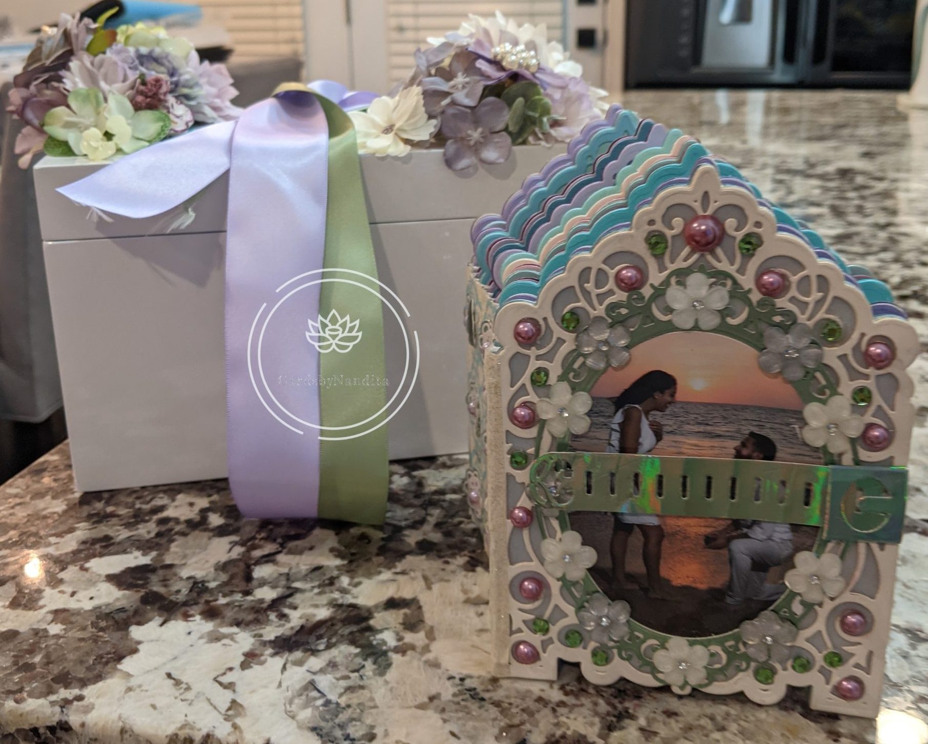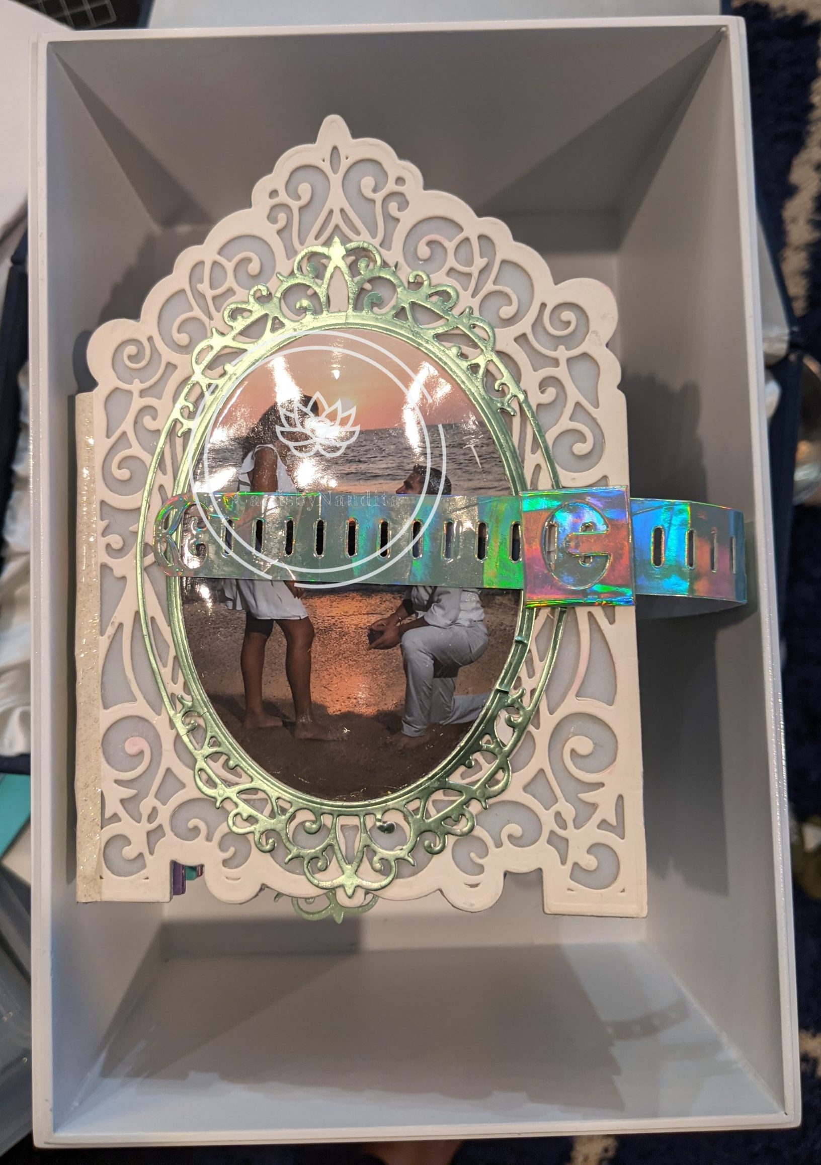 For the front cover, I used a combination of flat-back pearls, small floral trinkets, and green rhinestones. I used a photo from their engagement as the cover image. For the clasp of the album, I used partial die cutting to lengthen the clasp die included as part of the vignette die set. I cut the entire clasp from Tonic Studios’ iridescent mirror cardstock in Water Sprite.