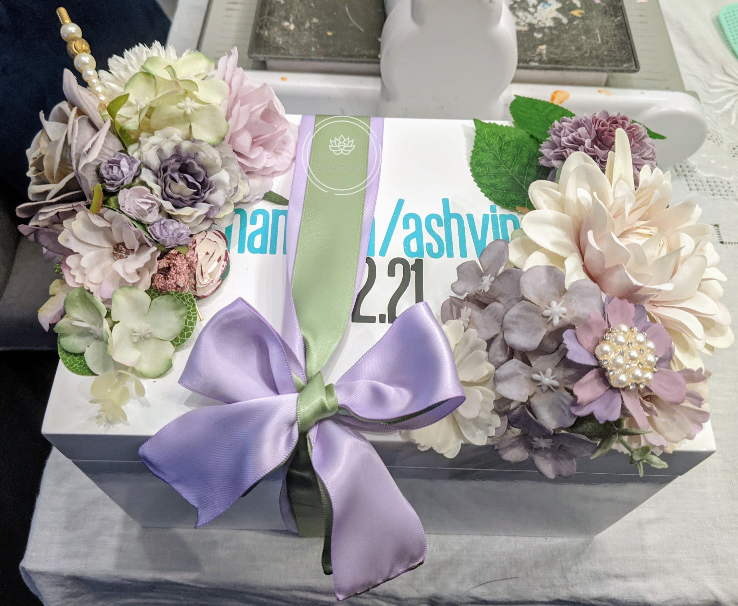 Once the album was complete, I needed a sturdy gift box that would also double as protection. I tried many, many options but eventually found a lacquer gift box at the Container Store, which was acid-free and the correct size. I decorated it with vinyl letters cut using Tim Holtz’s Classic Lower Alphanumeric dies, artificial flowers, and some embellishments from my stash. Conveniently, I had just enough leftover ribbon in Sage and Orchid to tie around the gift box.