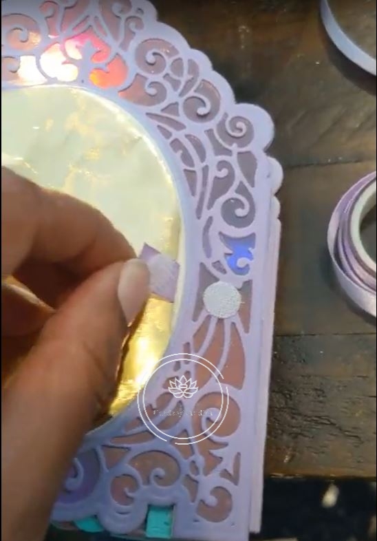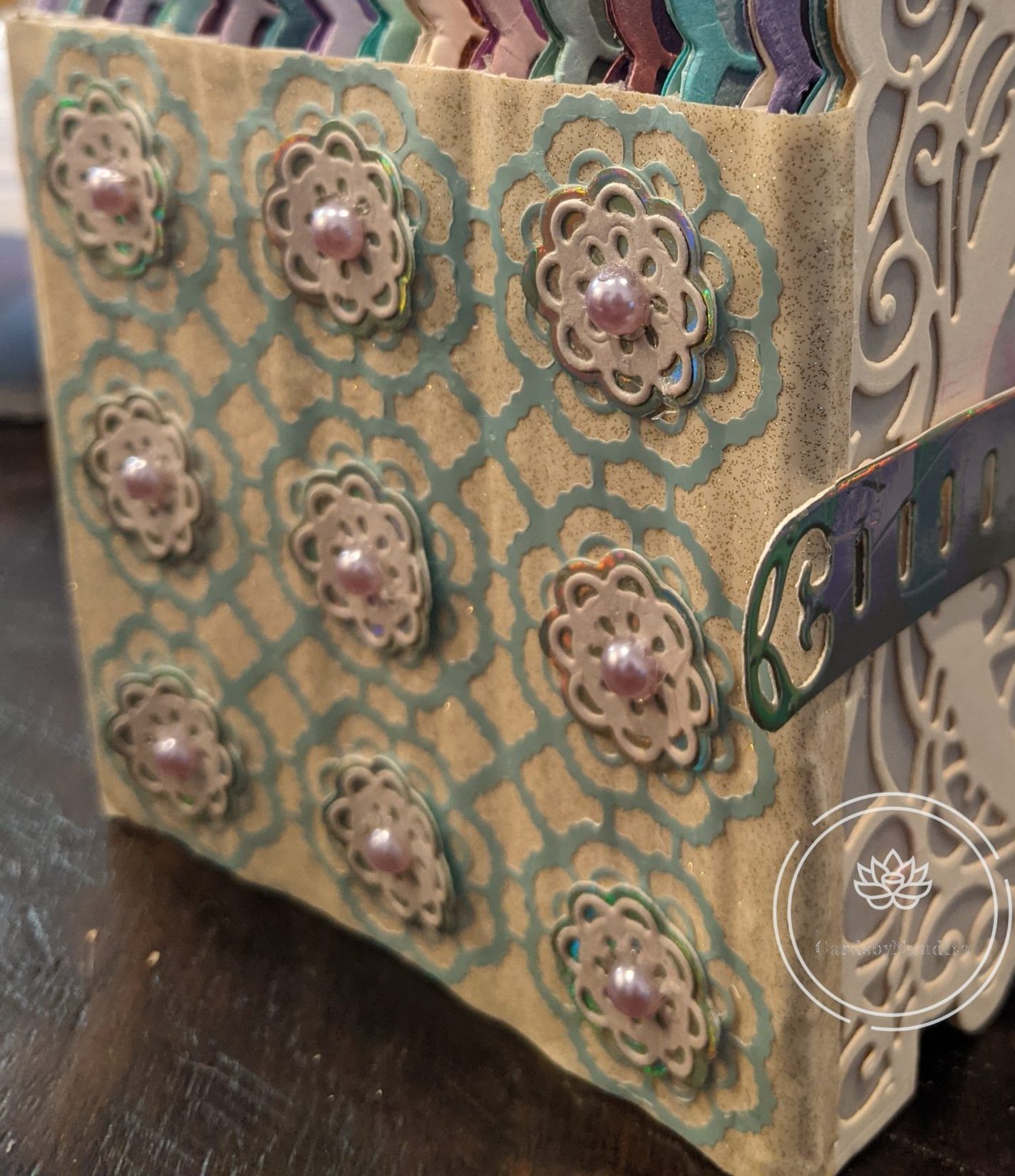 Once I finished assembling the album, I focused on embellishing the cover pages and spine. I mostly used die cuts, gems, and flat-back pearls. I used permanent vinyl on the spine as support and decoration over the Tyvek. On top of the vinyl panel, I placed small die-cut embellishments and flatback pearls.