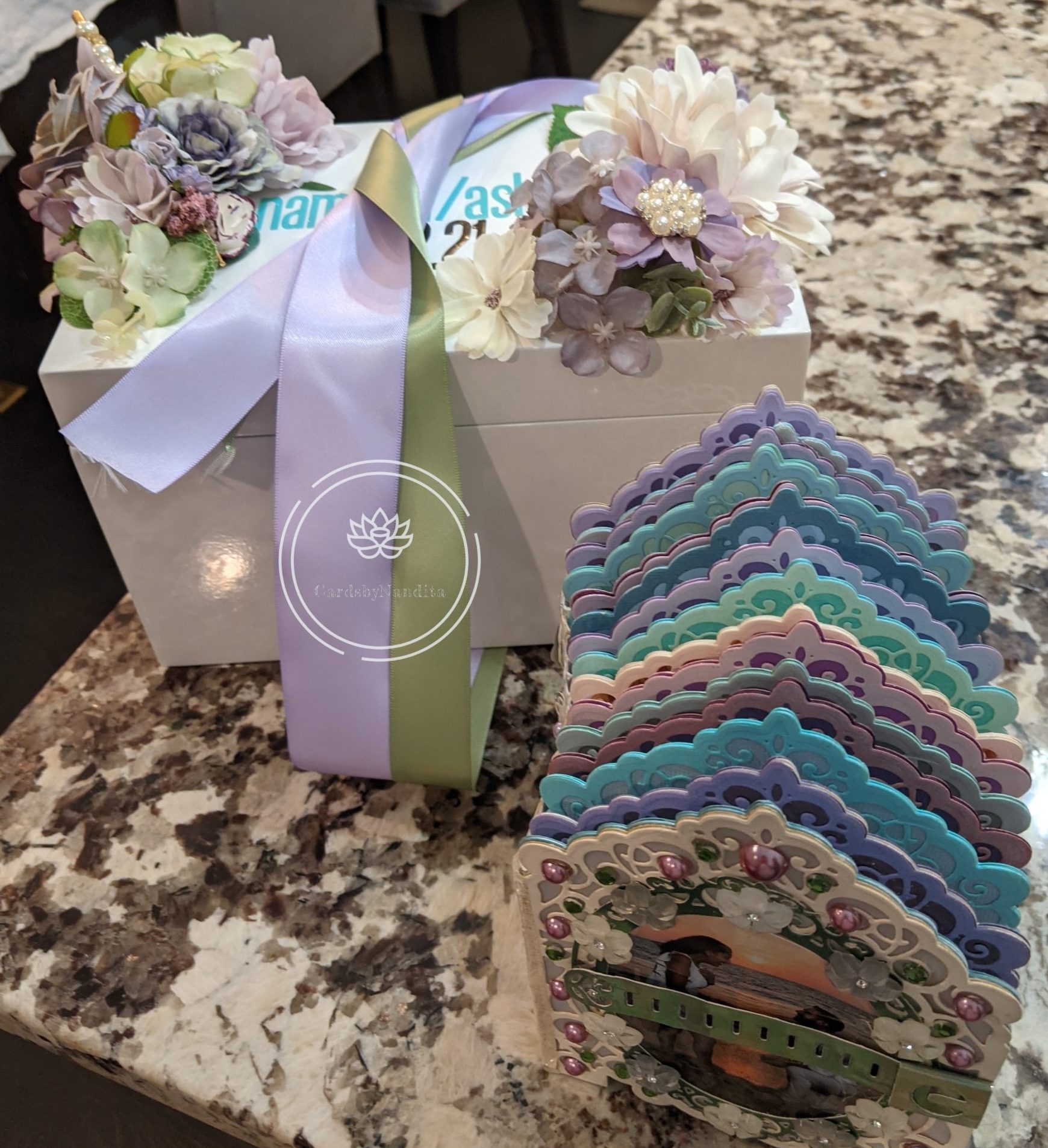 Meanwhile, once my sister started her wedding planning, I reached out to ask her about wedding colors. Based on her response, an inspiration board she shared, and knowing both my sister and brother-in-law liked purple – I chose Mint and Lavender as the main colors. Using my cardstock swatches, I pulled out shades that matched or complemented the inspiration. I ended up choosing a variety of both regular and specialty cardstock. For regular cardstock, I picked 100#/110# from Bazzill, Gina K, Lawn Fawn, Papertrey Ink, Hero Arts, MFT, Reverse Confetti, Simon Says Stamp and Taylored Expressions. Since I only use specialty cardstocks to die cut or layer, paperweight wasn’t important and I stuck to Grafix, Papertrey Ink, and Tonic Studios.