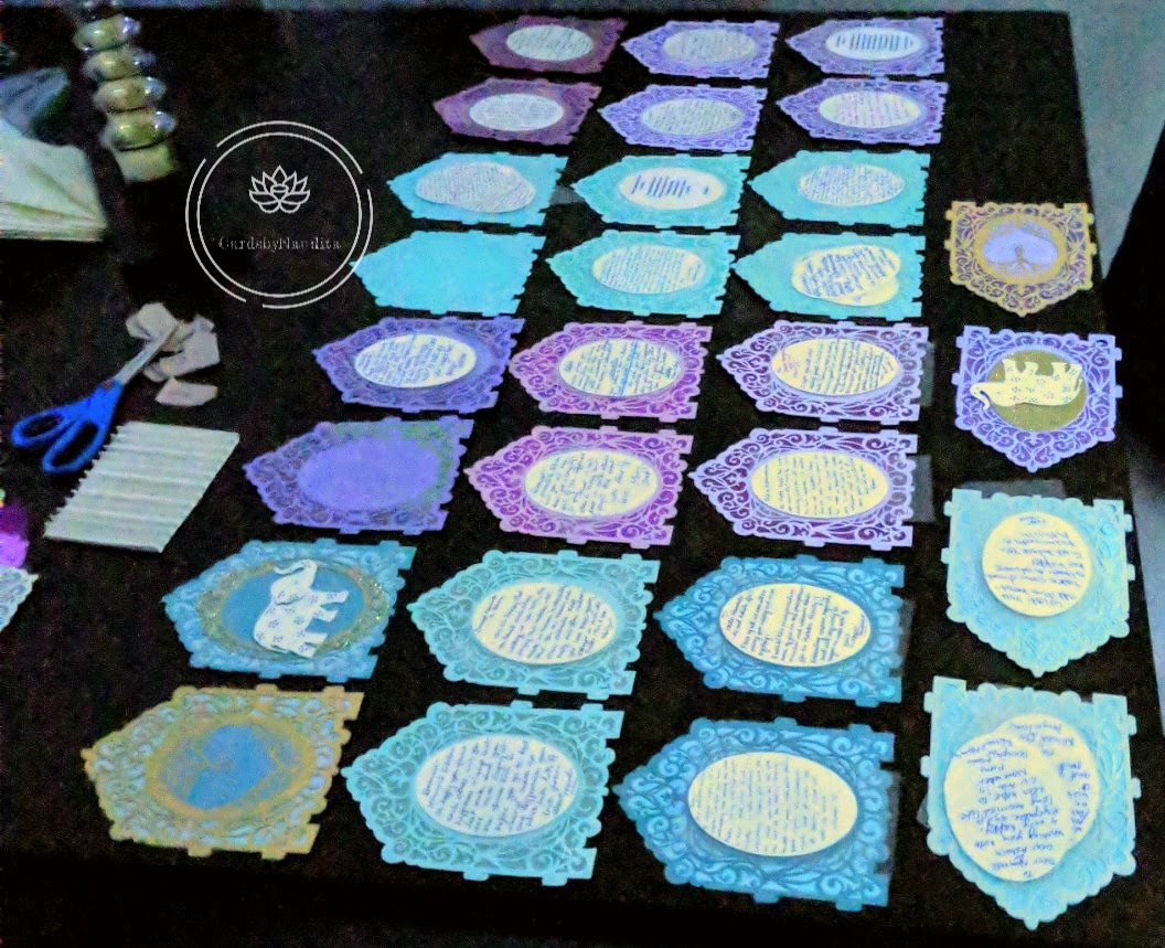 Once I had that finalized, I placed every gold, lavender/lilac, and aqua/mint embellishment that matched the final cardstock colors in a project bin. Separating my embellishments like this I could see the only items I was low on and might need to get were artificial flowers and flatback pearls.