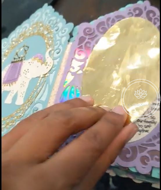 To keep it manageable, I worked on the album in parts. After getting the basic pages, I first die-cut small decorations and panels. I cut Spellbinders’ Elephant Festival die in coordinating shades of Mint/Lavender. Then I used the same Spellbinders’ Classic Nested Ovals LG die and partial die cutting to create panels that would be able to fold out so I could layer photos on top of the messages. I pulled out a few of the pocket, swirl, and tag dies in my collection and cut them from the specialty cardstocks to have options for decorating some of the pages.