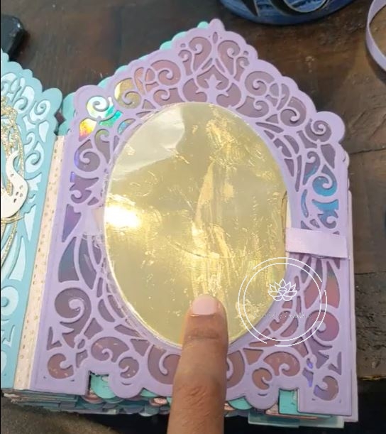 The inside pages, I kept mostly free of extra embellishments. I wanted the focus to be on the messages and photos. Instead, I limited the decoration on the inside to a few intricate die cuts. All of the message/photo panels were layered with an intricate oval die cut from a few different Spellbinders sets.