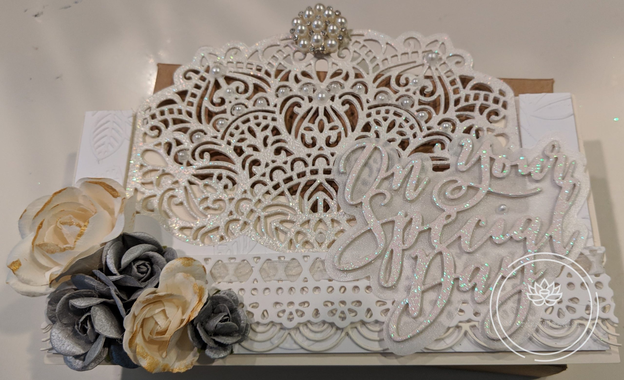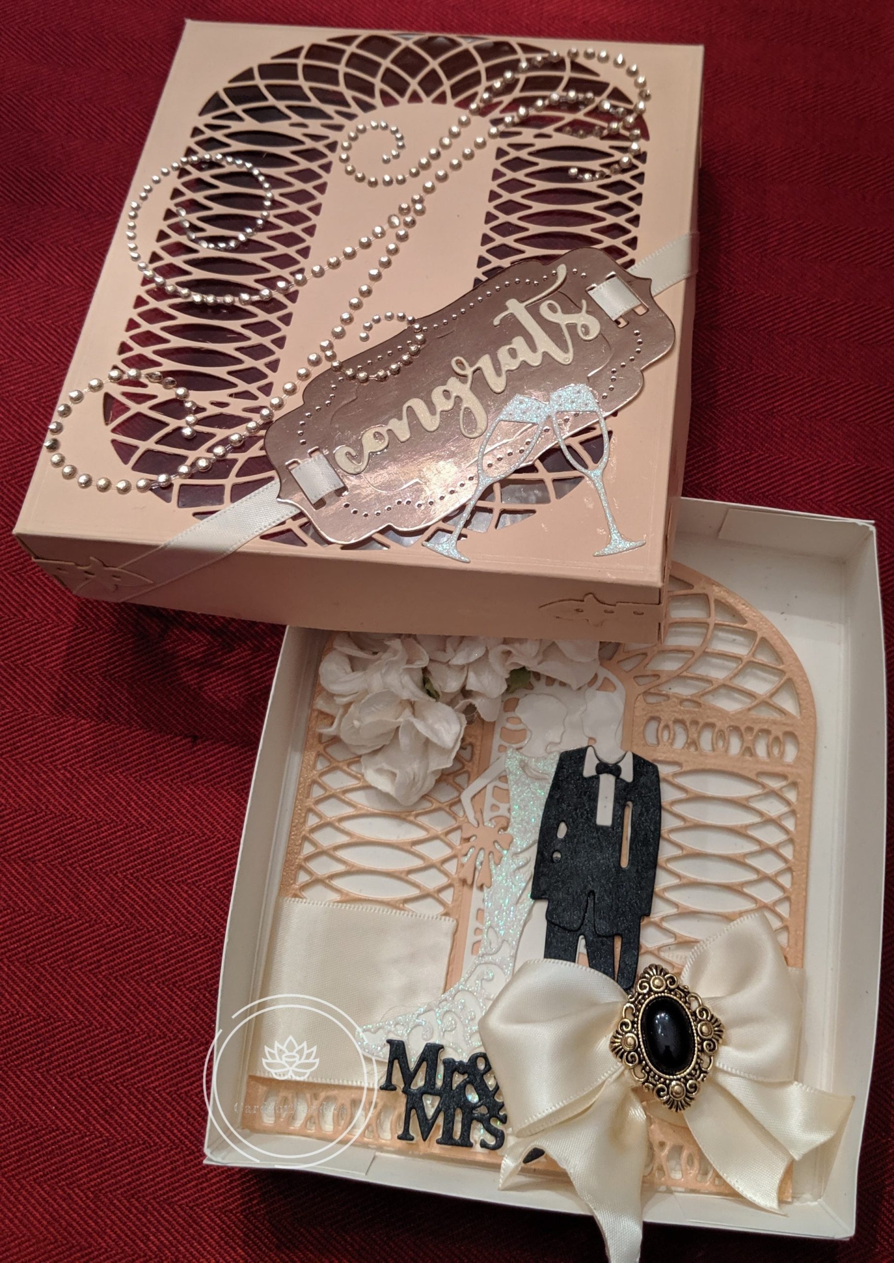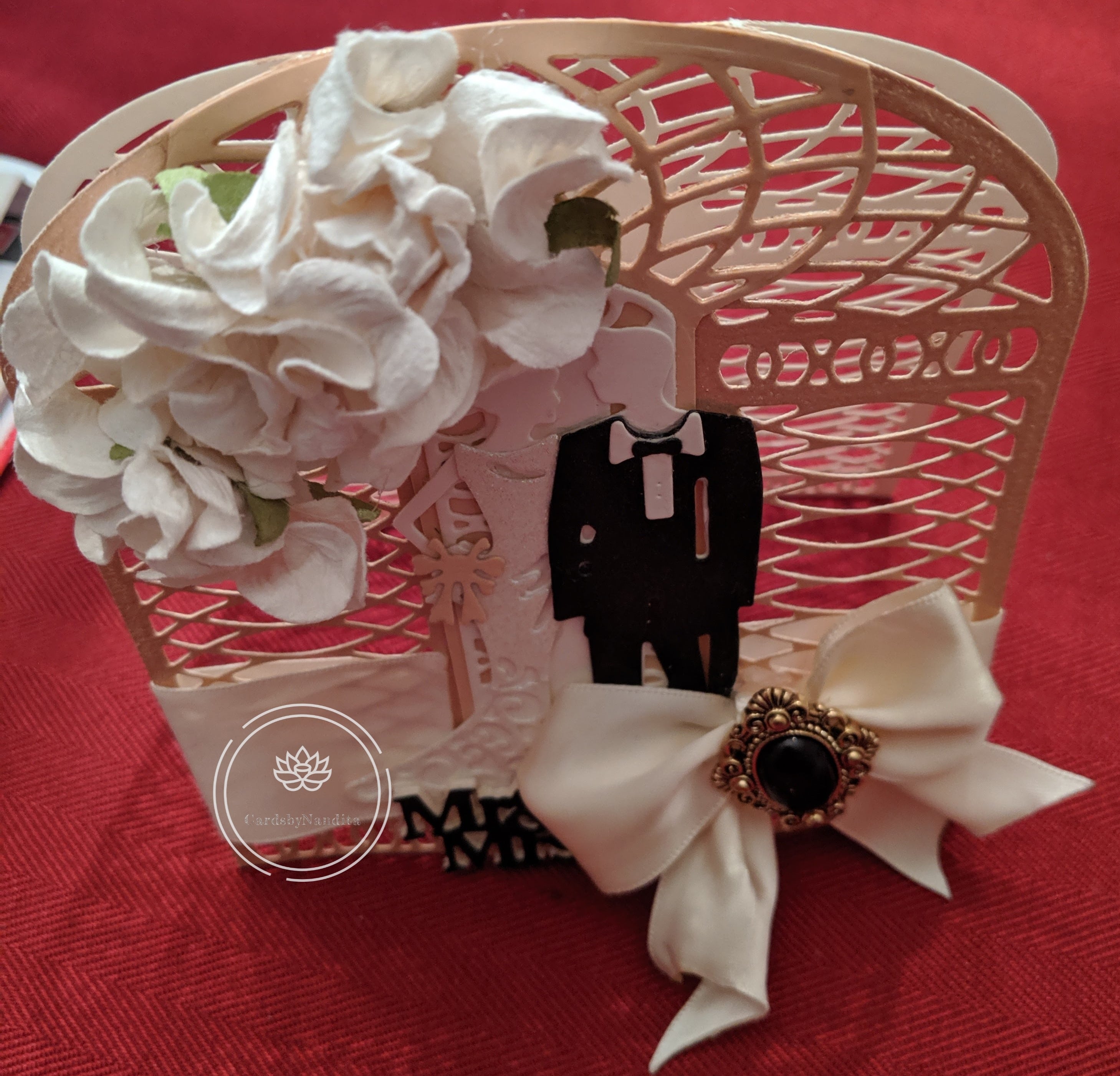 For a western wedding my sister attended, I still used intricate die cuts, but kept the colors soft and neutral. I also had a a paper pieced couple as the focal point and the only dimension was from flower/ribbon embellishments. The card box and the card base were both cut using a Spellbinders’ Amazing Paper Grace die of the month (March 2019: Spun Blessings Oval). For the base, I cut the bottom curved section off to keep it a flat bottom, while for the box I only used the inserts to make it a continuous oval. This is another card that I want to re-create when I have some free time but with some different colors.