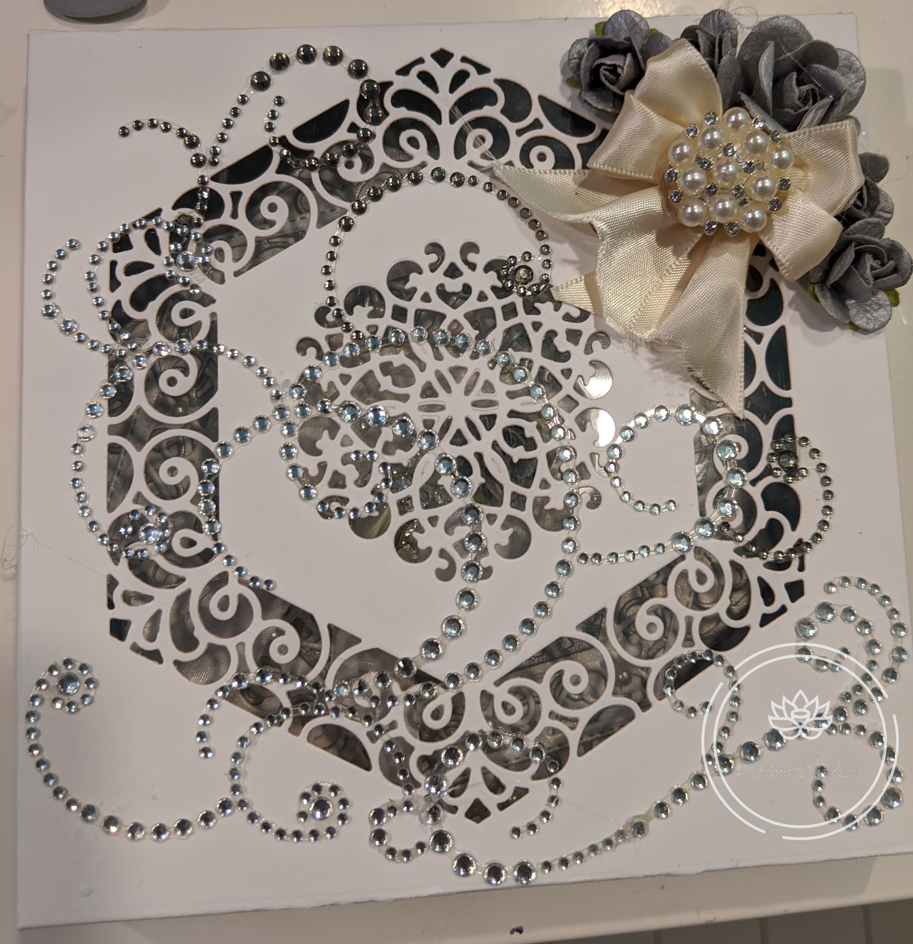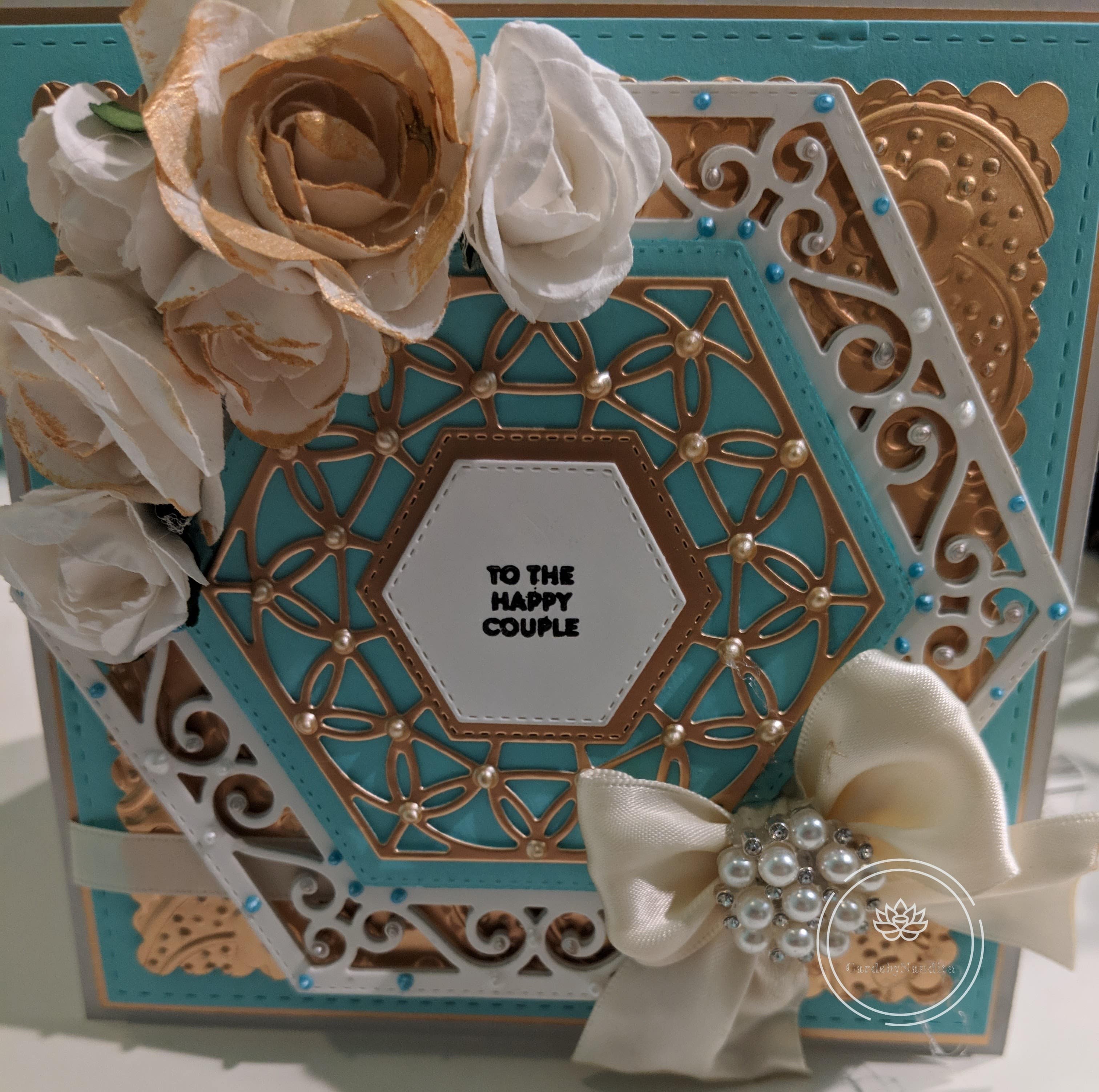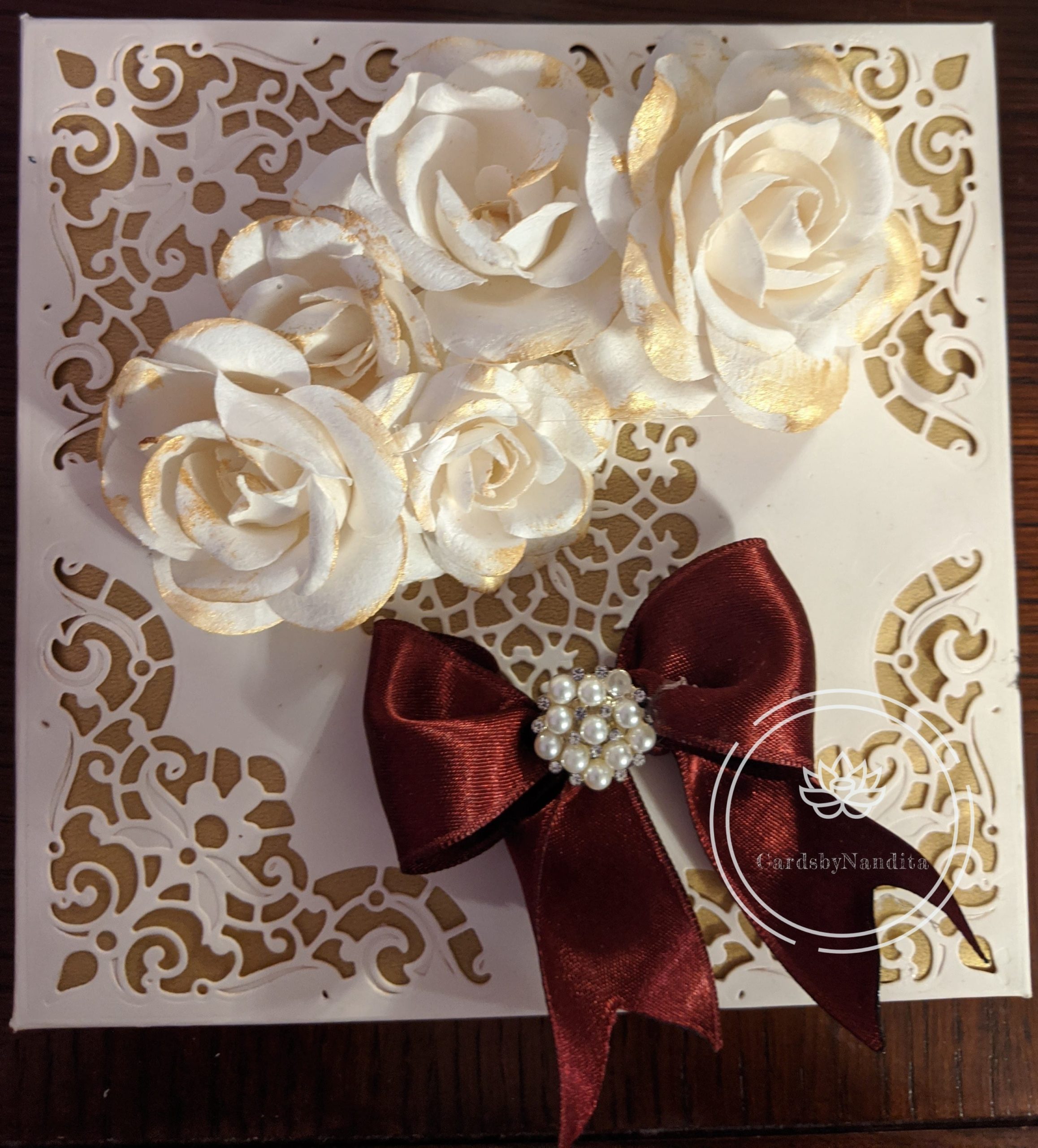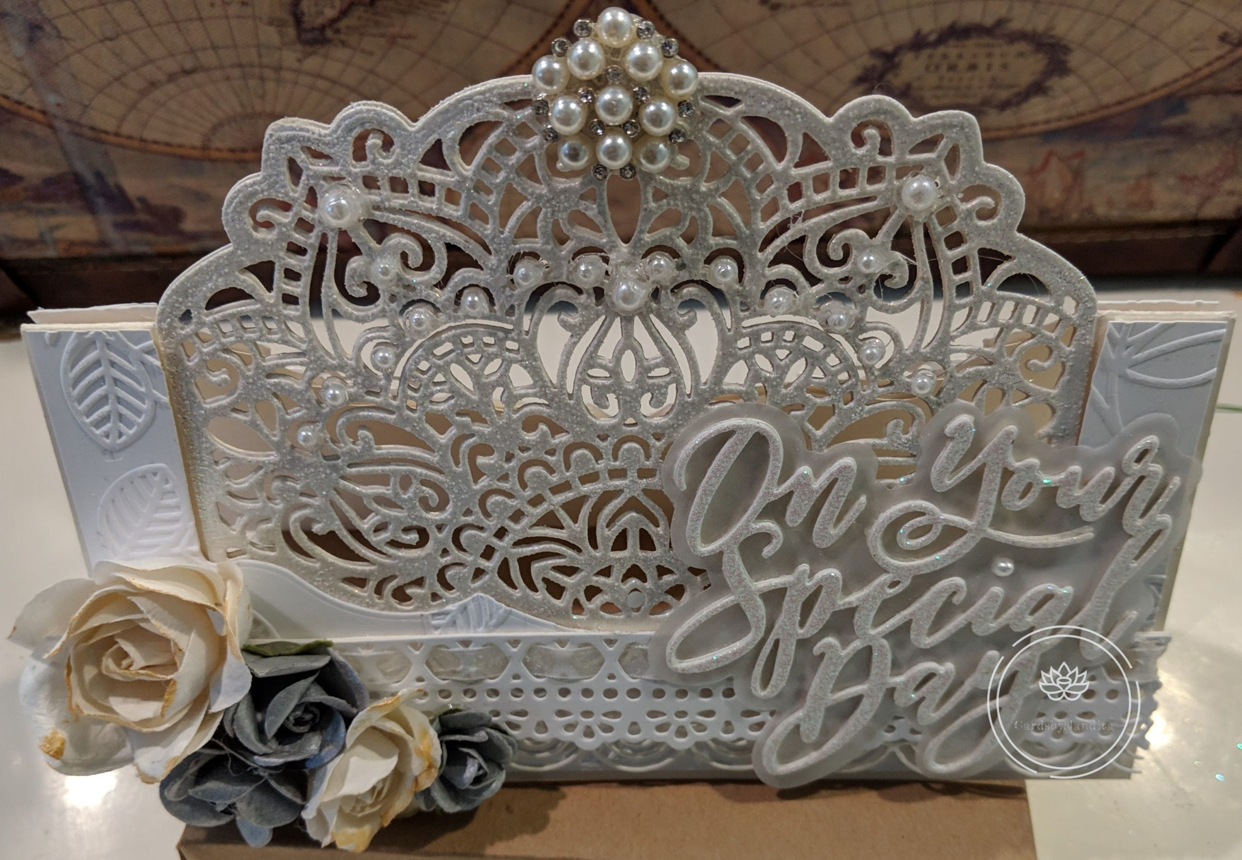 For a western wedding my sister attended, I still used intricate die cuts, but kept the colors soft and neutral. I also had a a paper pieced couple as the focal point and the only dimension was from flower/ribbon embellishments. The card box and the card base were both cut using a Spellbinders’ Amazing Paper Grace die of the month (March 2019: Spun Blessings Oval). For the base, I cut the bottom curved section off to keep it a flat bottom, while for the box I only used the inserts to make it a continuous oval. This is another card that I want to re-create when I have some free time but with some different colors.
