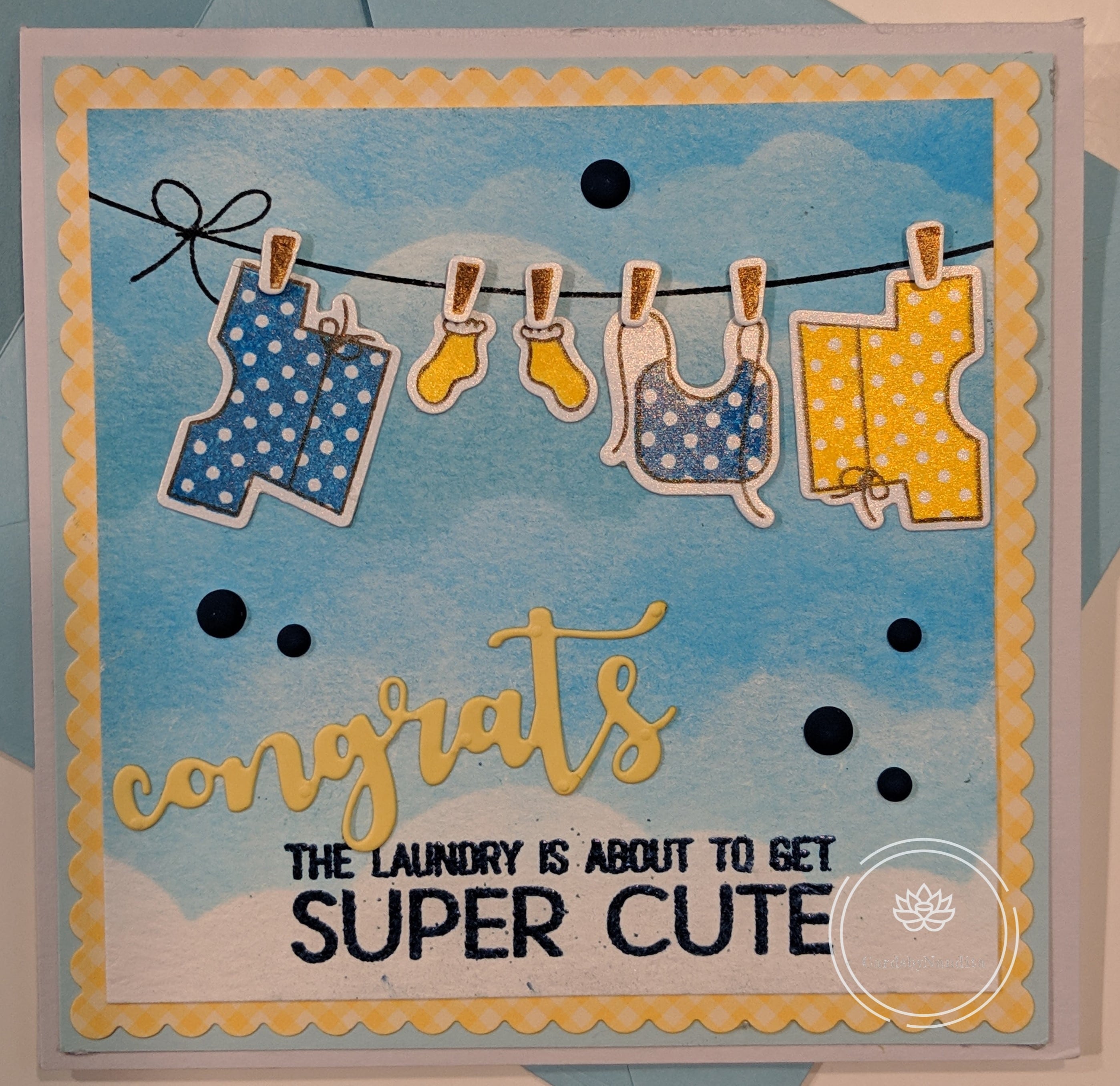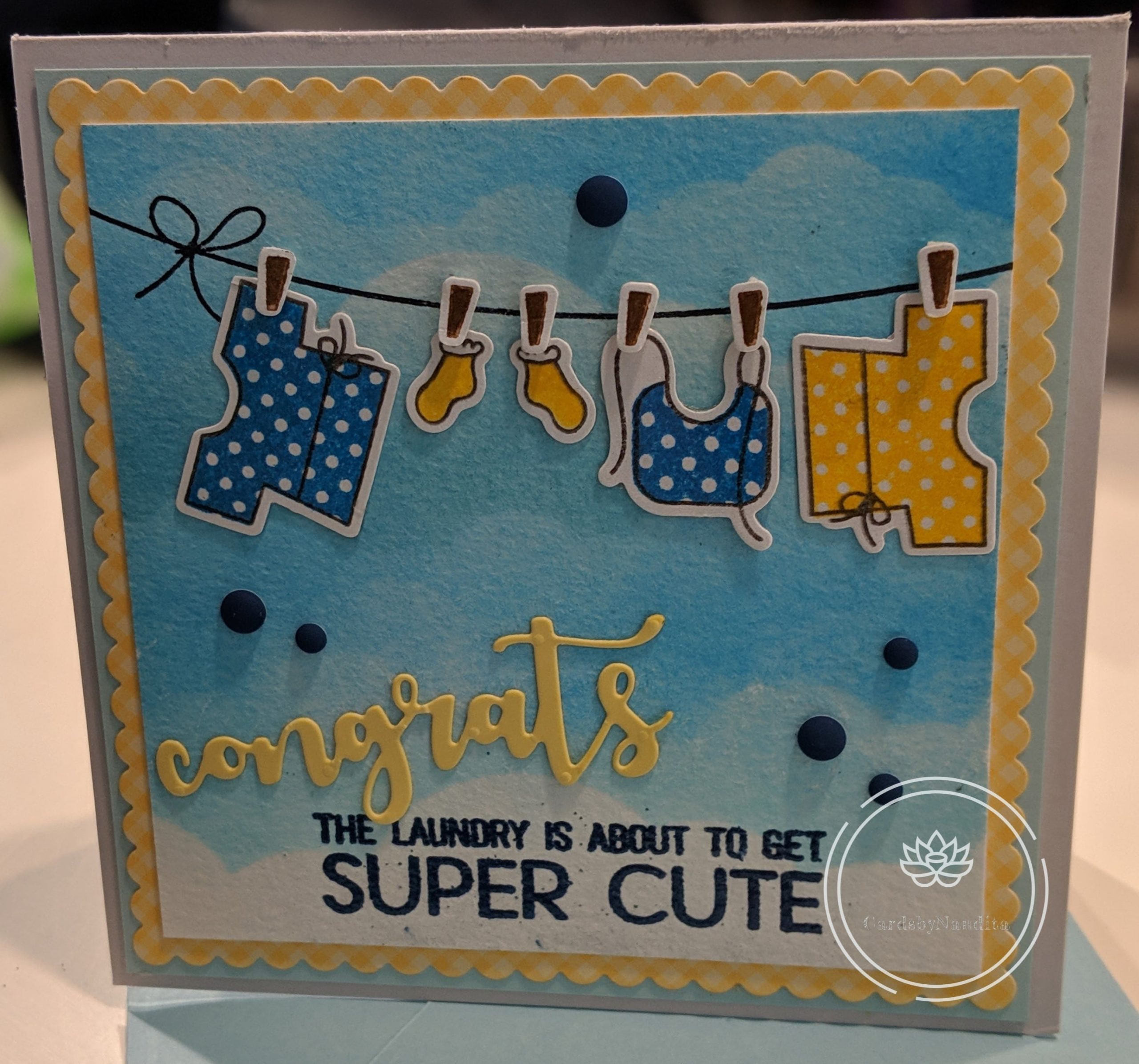 Between holiday sales and birthday gifts, I completed my distress ink collection in 2019 and made multiple ink blended backgrounds. One of my favorite combos blended Chipped Sapphire and Weathered Wood. With how busy I was, I just set the backgrounds aside and didn’t actually create any cards. Then in April, when I needed a card for my uncle’s birthday, I was able to pull them out to create some quick birthday cards. I used Card Making Magic’s Masculine Additions stencil to add some interest. Then added the adorable dinosaur from Lawn Fawn’s RAWR! stamp (+coordinating die) and a happy birthday sentiment from an old Sizzix die. My sister also requested a card for her best friend’s baby shower around this time – I was excited to finally be able to try out my Lawn Fawn Cloudy stencil and the MFT Welcome Baby stamp/die set. I also went with a 6×6 design, since it gave the card a more cutesy look.