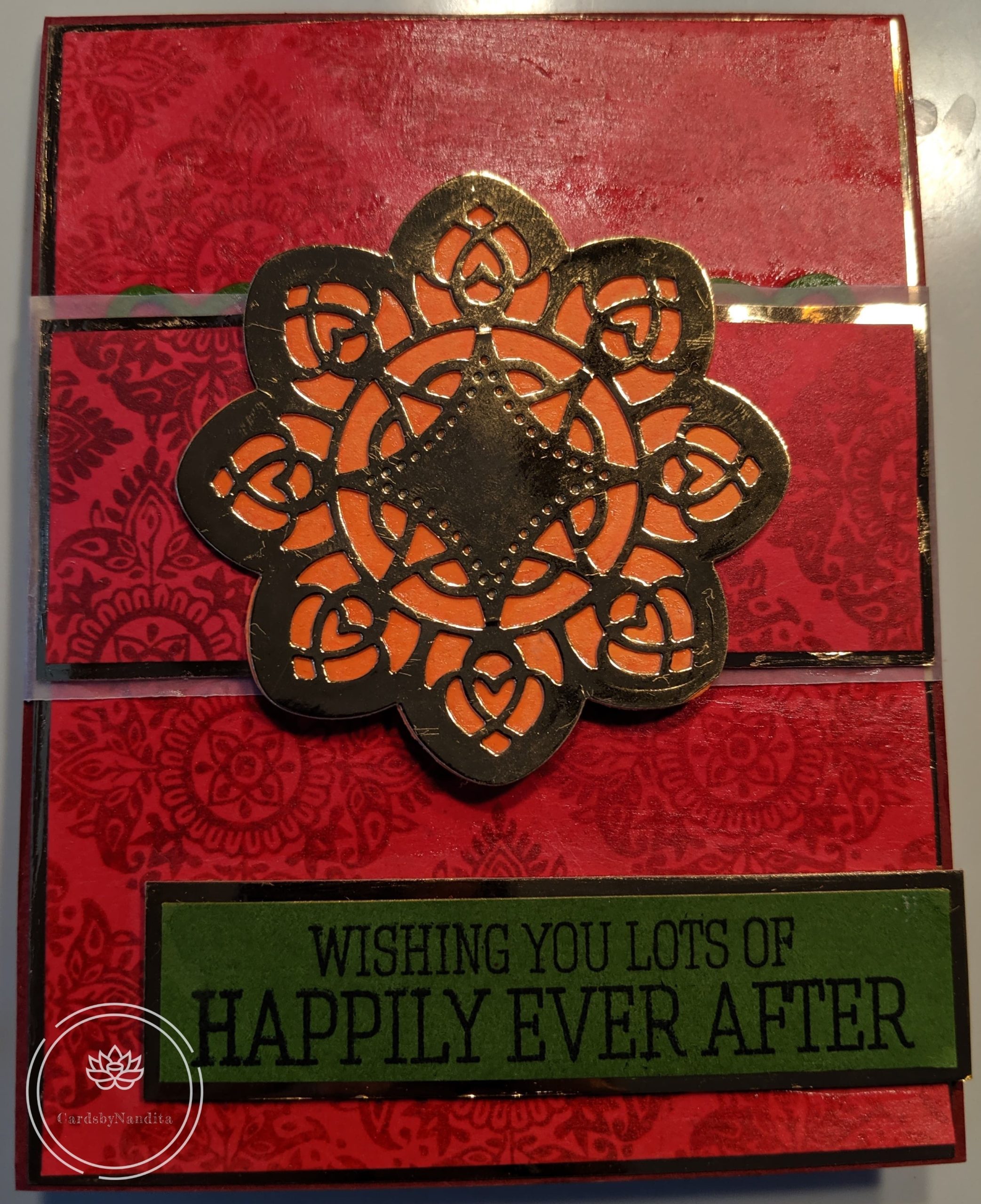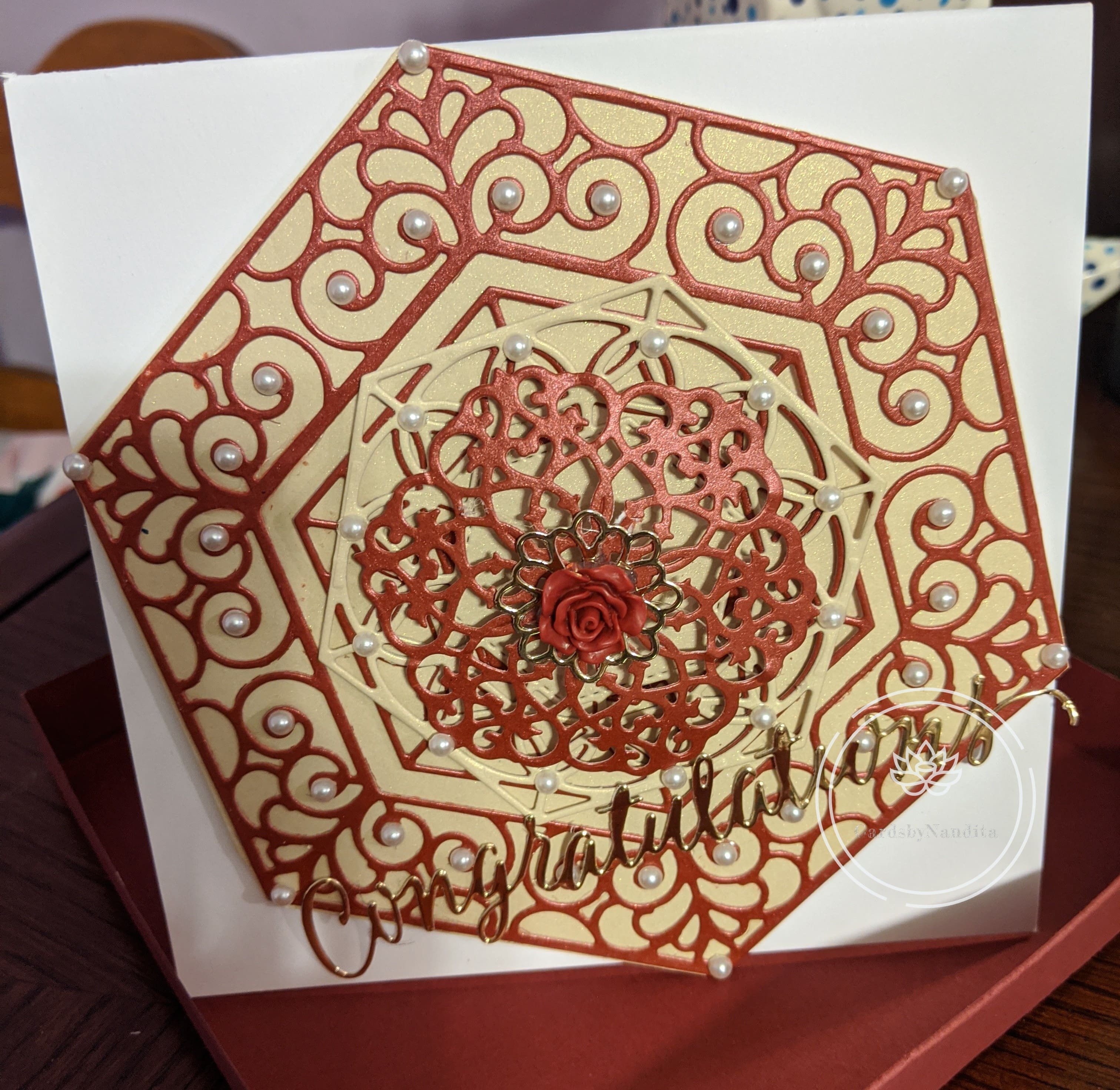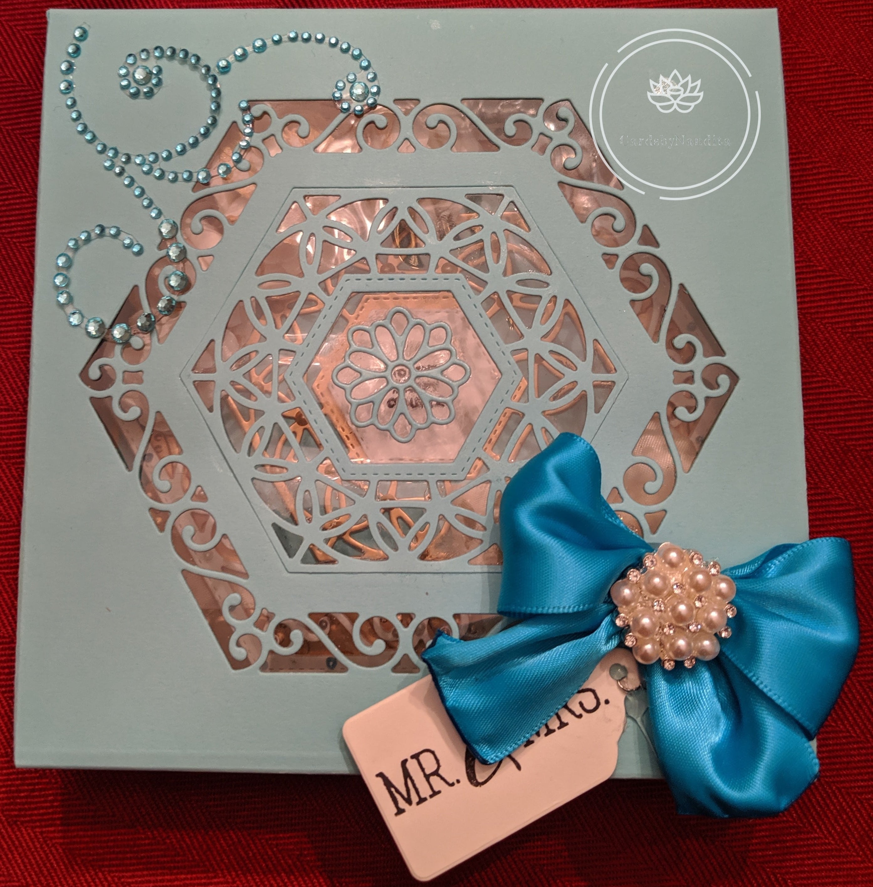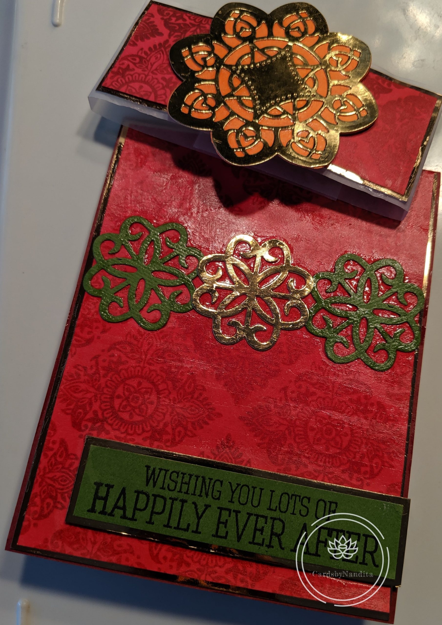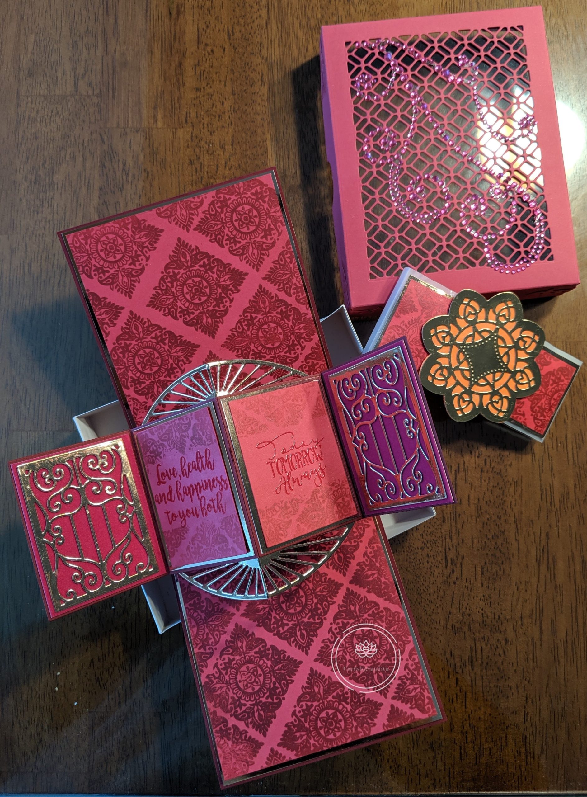 The next wedding card was for one I attended with my family – I used Spellbinders APG Die of the Month (April 2019: Elegant Swivel & Sashay Card) dies to make an interactive card. I was having trouble finding anything in the colors and patterns of the invite, so I ended up creating my own patterned paper. I used woodblock stamps from a company that works with Indian artists to create beautiful and unique stamps (Blockwallah). The card box also turned out great – I used a Card Making Magic cover die to cut out an intricate pattern on the top and then glued acetate inside so you could see through to the card.
