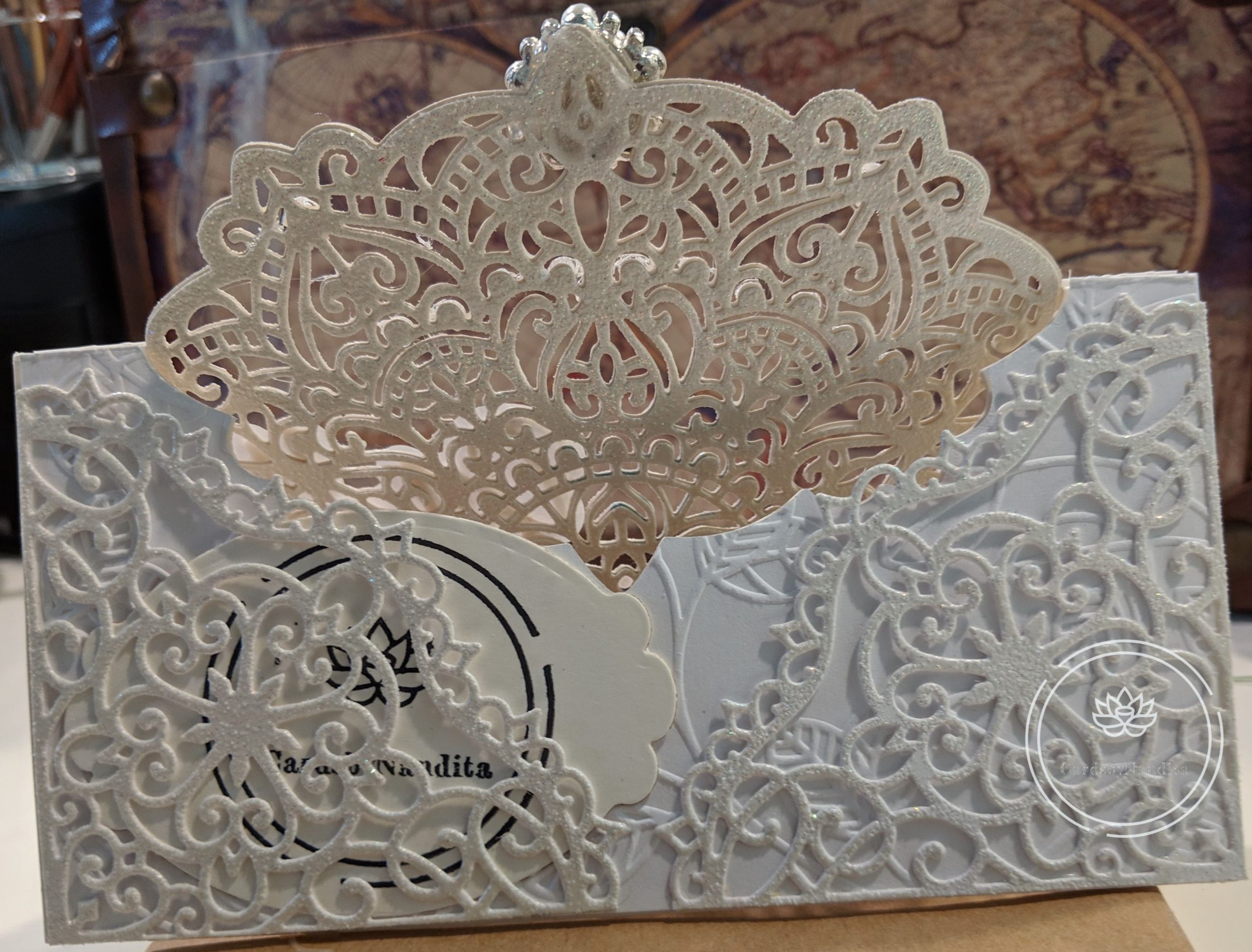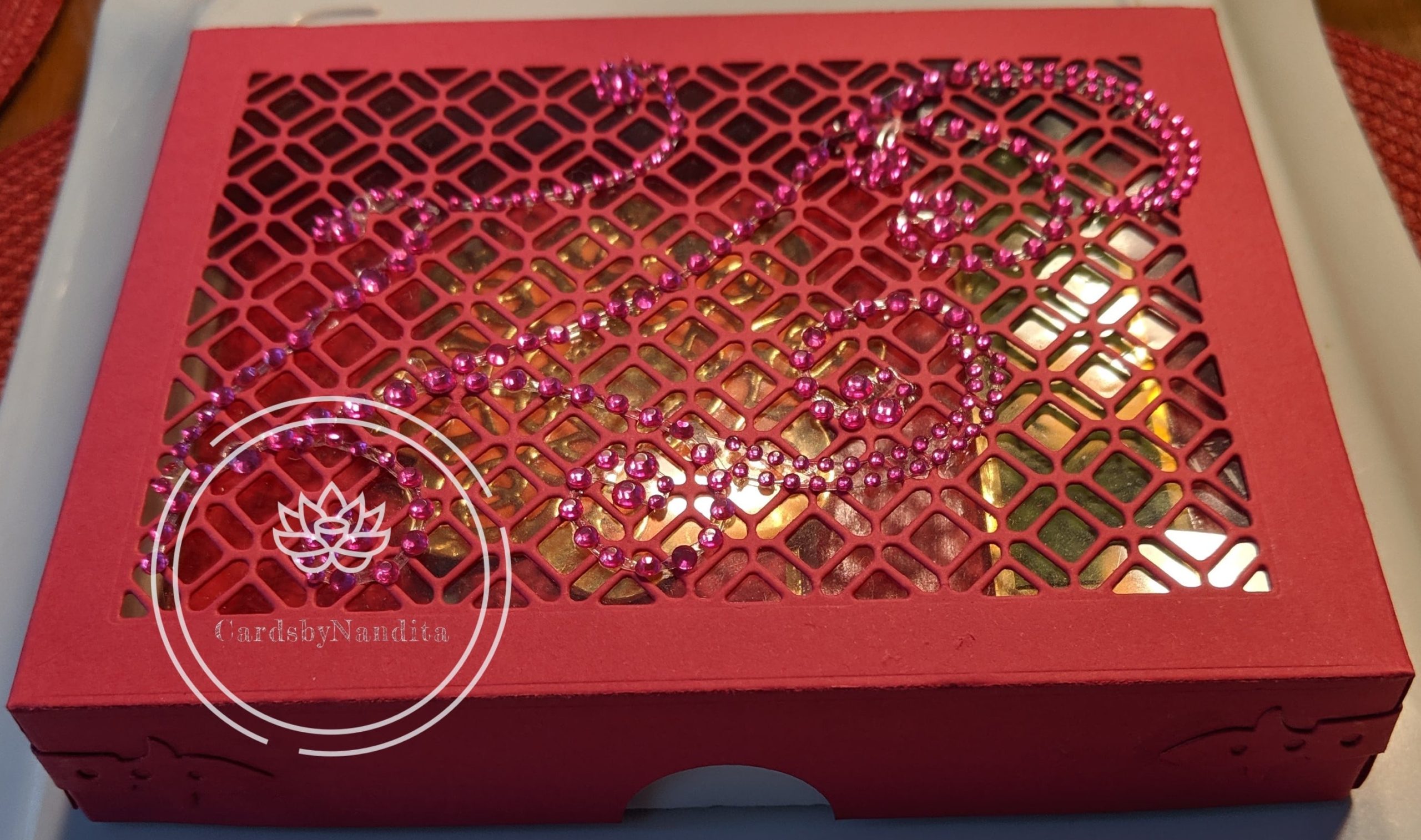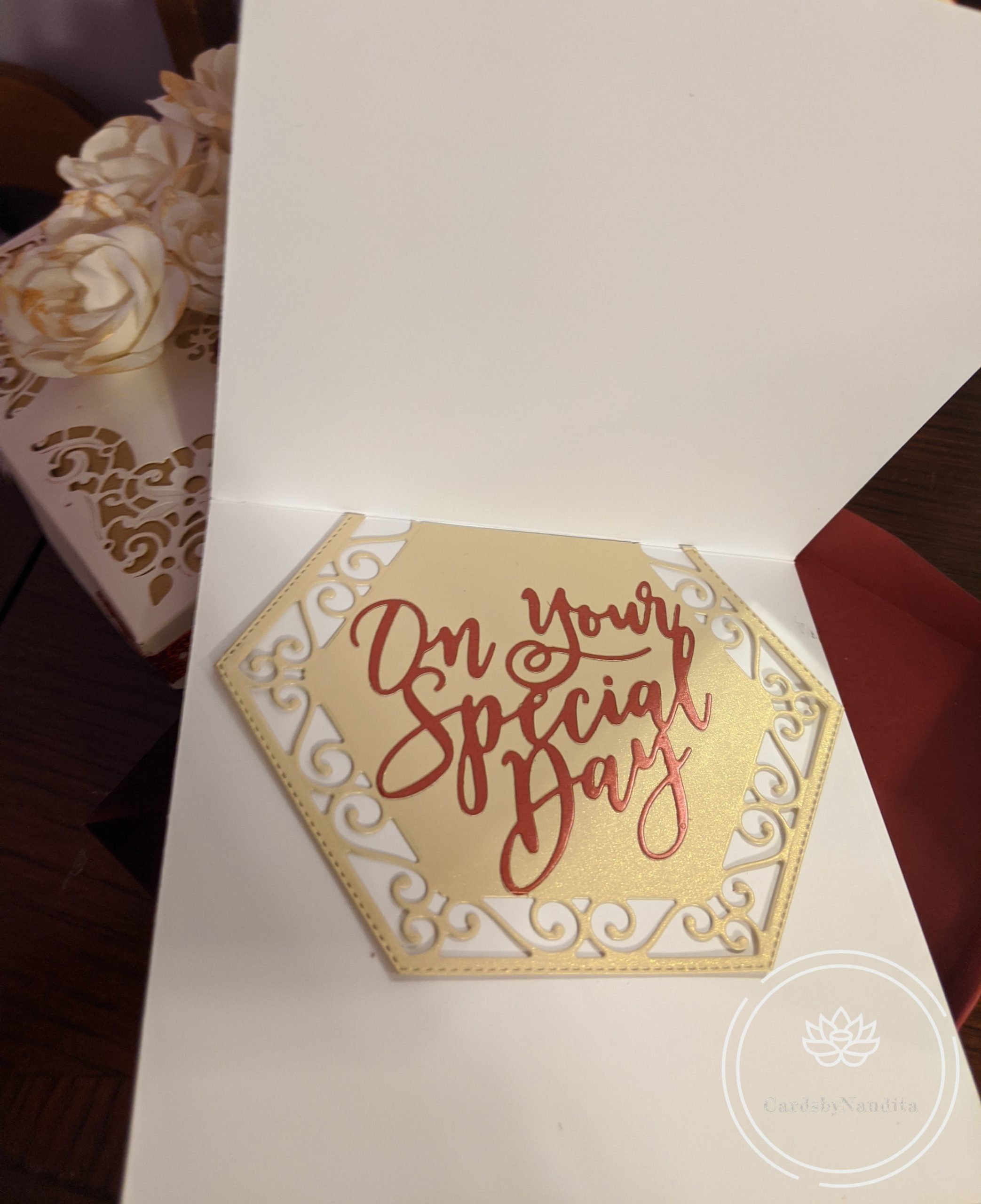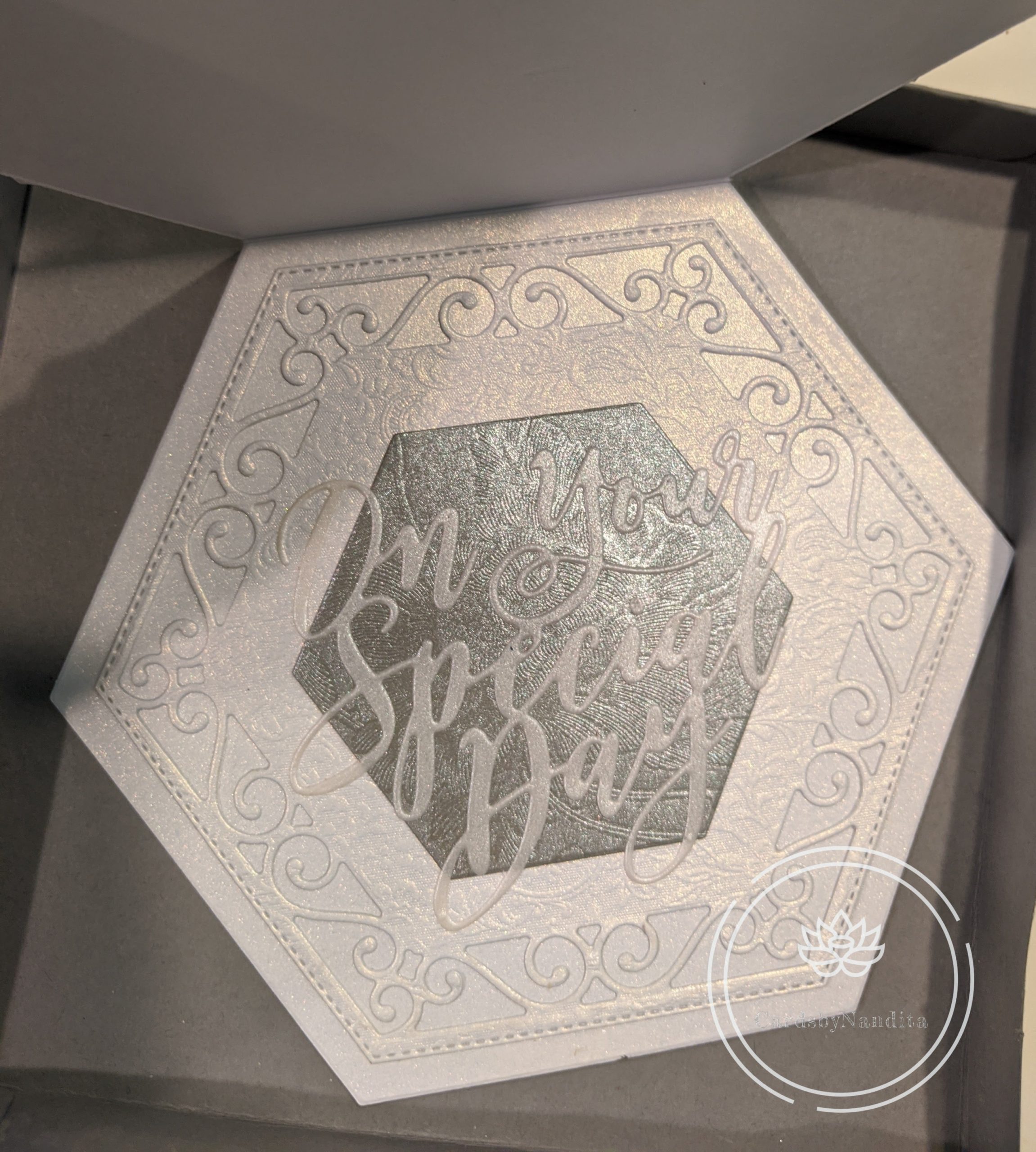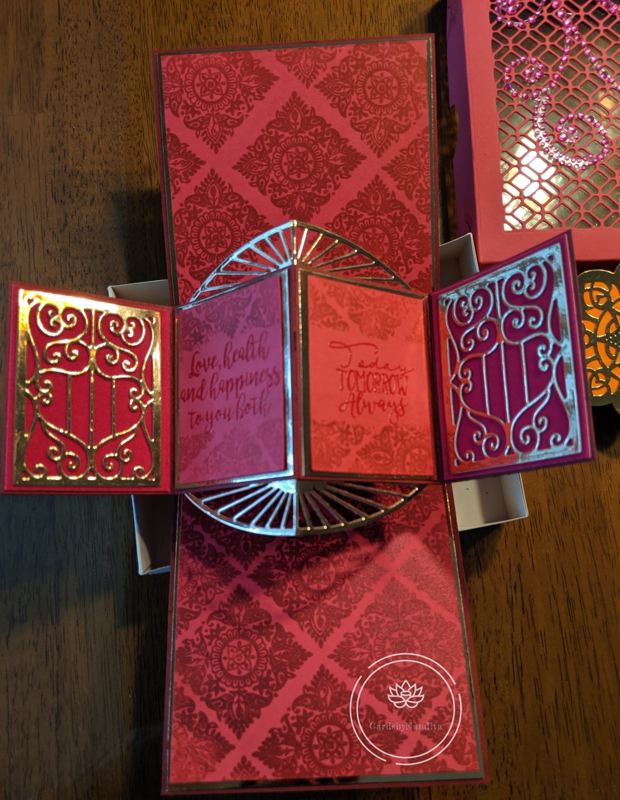 The next wedding card was for one I attended with my family – I used Spellbinders APG Die of the Month (April 2019: Elegant Swivel & Sashay Card) dies to make an interactive card. I was having trouble finding anything in the colors and patterns of the invite, so I ended up creating my own patterned paper. I used woodblock stamps from a company that works with Indian artists to create beautiful and unique stamps (Blockwallah). The card box also turned out great – I used a Card Making Magic cover die to cut out an intricate pattern on the top and then glued acetate inside so you could see through to the card.