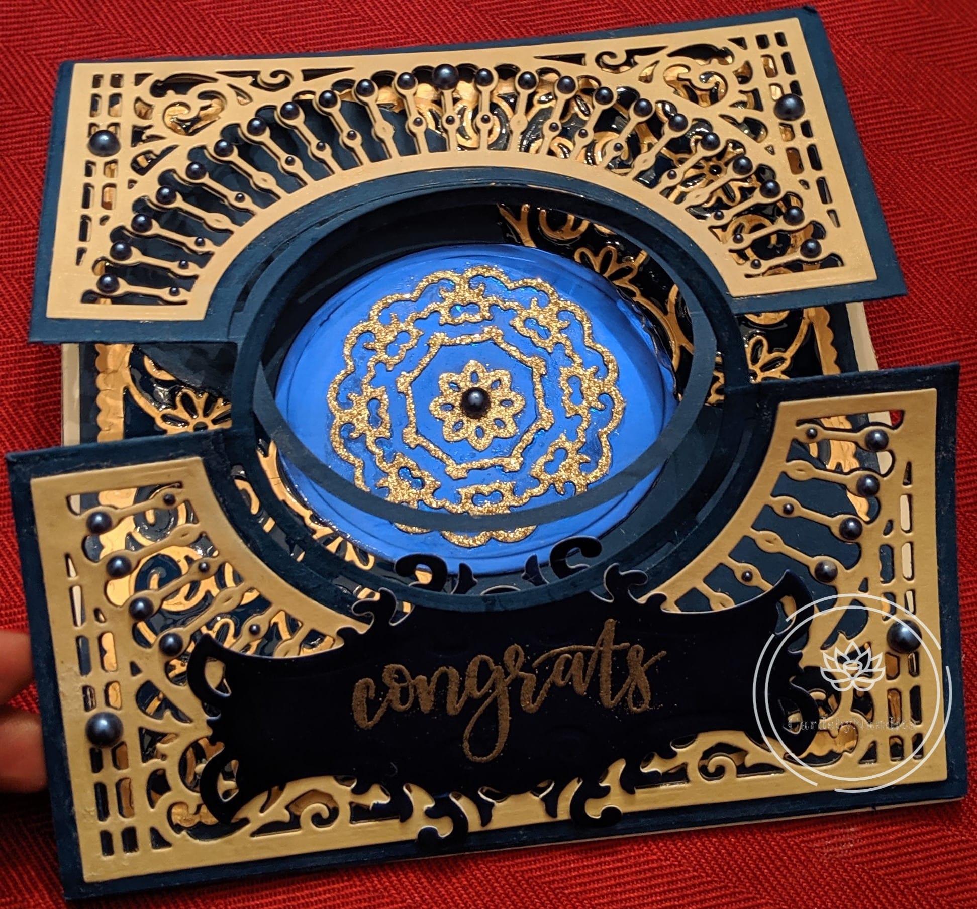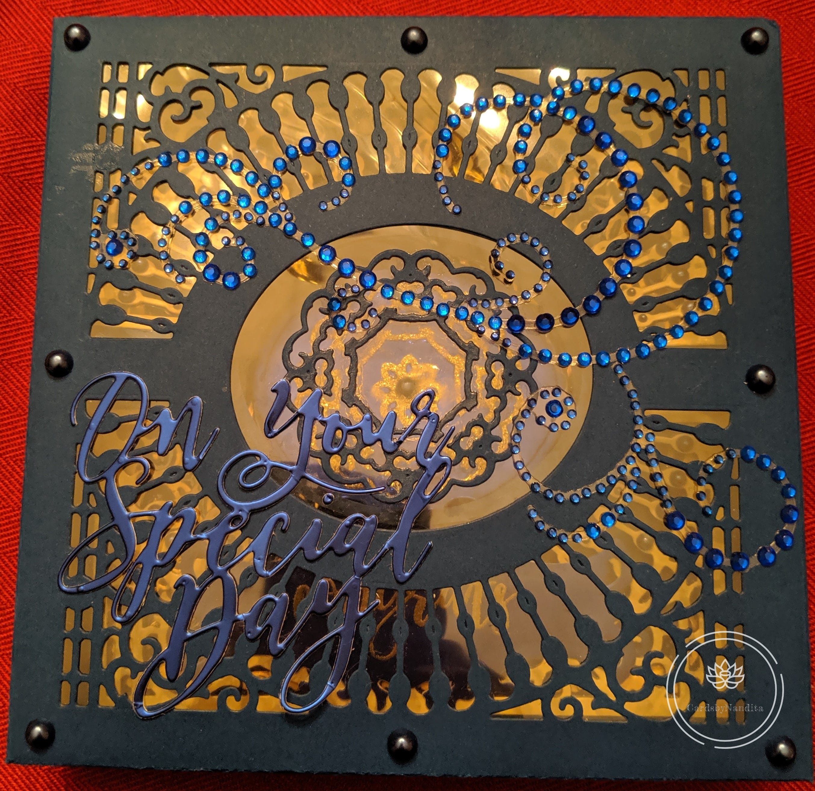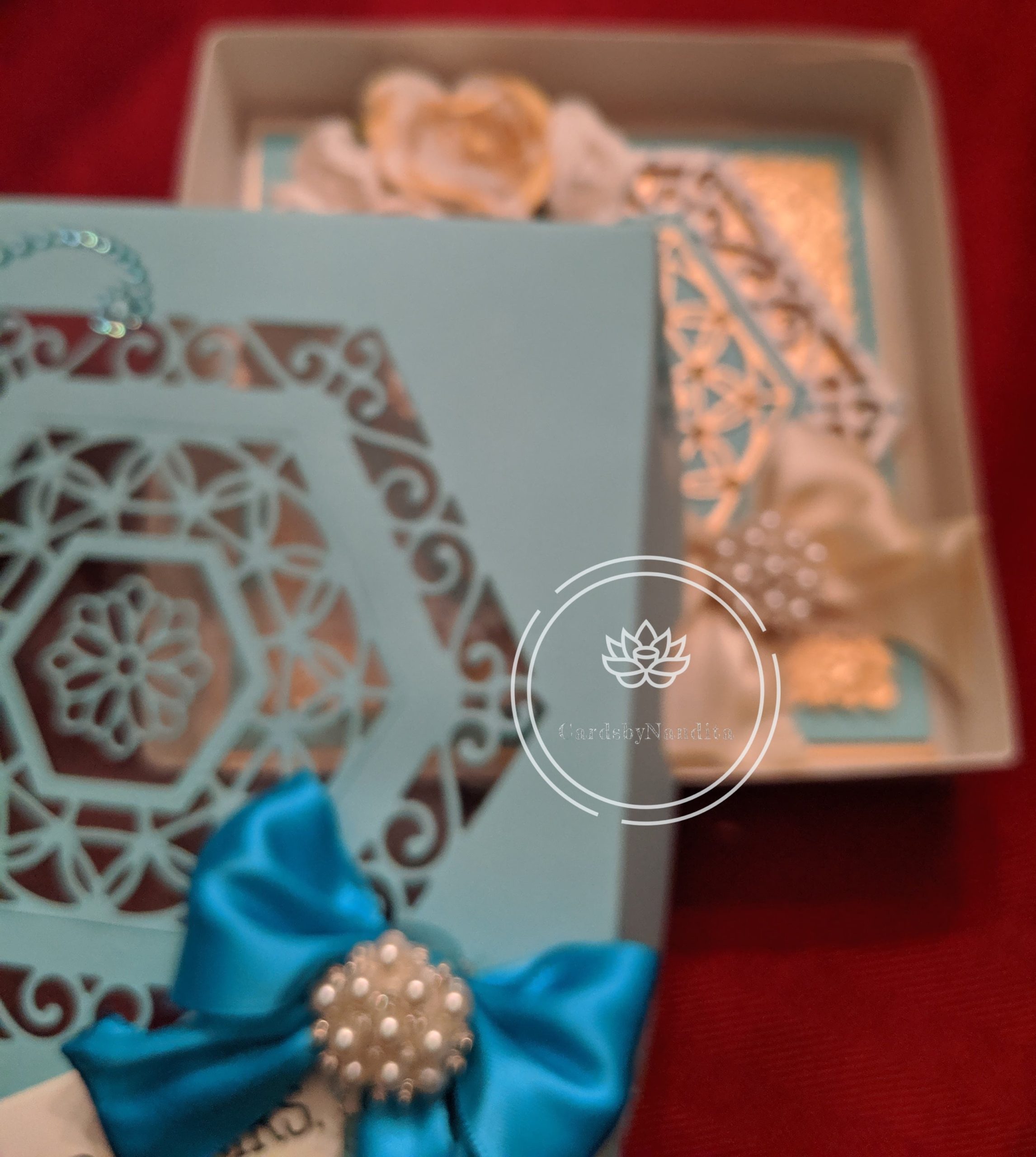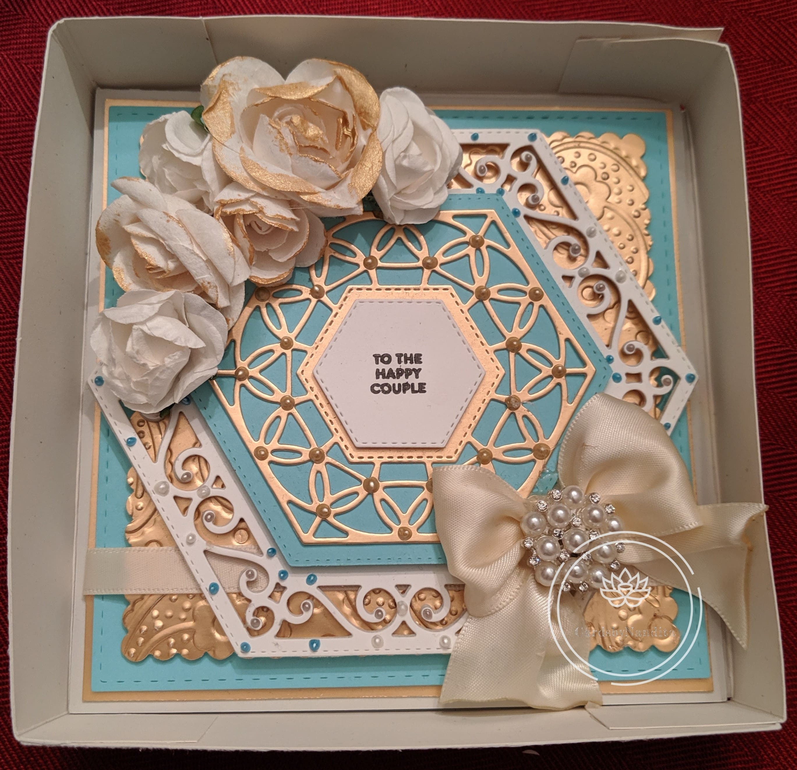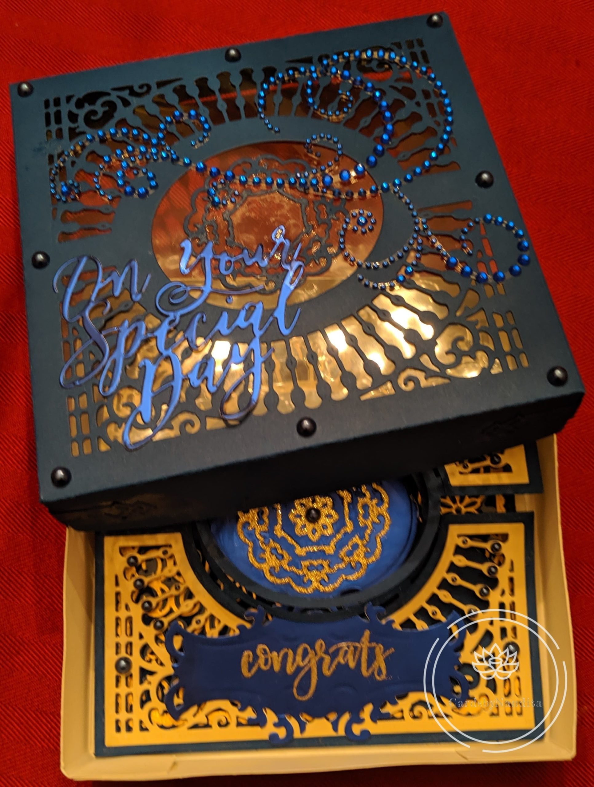 The next 2 (!) weddings my sister attended were Indian weddings – so for those I went back to a colorful style and matched the wedding invites. For the aqua/gold card I used mainly Card Making Magic dies, while for the navy/gold, I used the Spellbinders Amazing Paper Grace die of the month (December 2018: Softly Spoke’n Flip and Gatefold Card). The navy/gold wedding card was for a closer friend, so it was much more detailed then a similar card I made in the Winter. I liked both the card and matching box – but I think in the future if I re-create this card, I will keep the inside panel simple.
