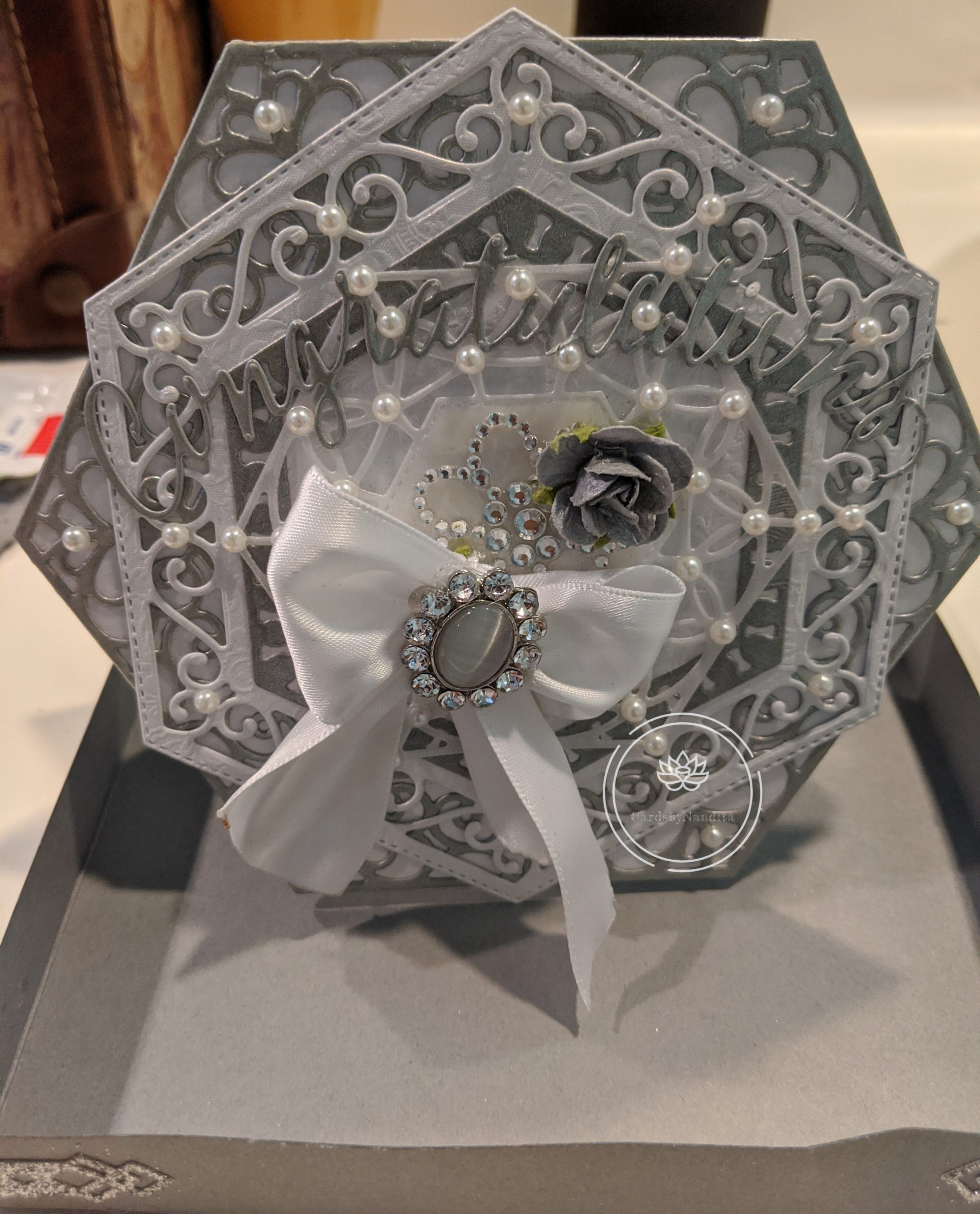 For a wedding my sister attended as her then-boyfriend’s plus one, I used the same hexagon die set from Card Making Magic as in the aqua/gold card. I kept the card a 6×6 square but made the hexagon layers flat. The colors were also more traditional with creams, golds, and maroon. The silver/white wedding card was another shaped card using the hexagon dies, but I used more layers and embellishments to make it a flashier card since it was a closer relationship.