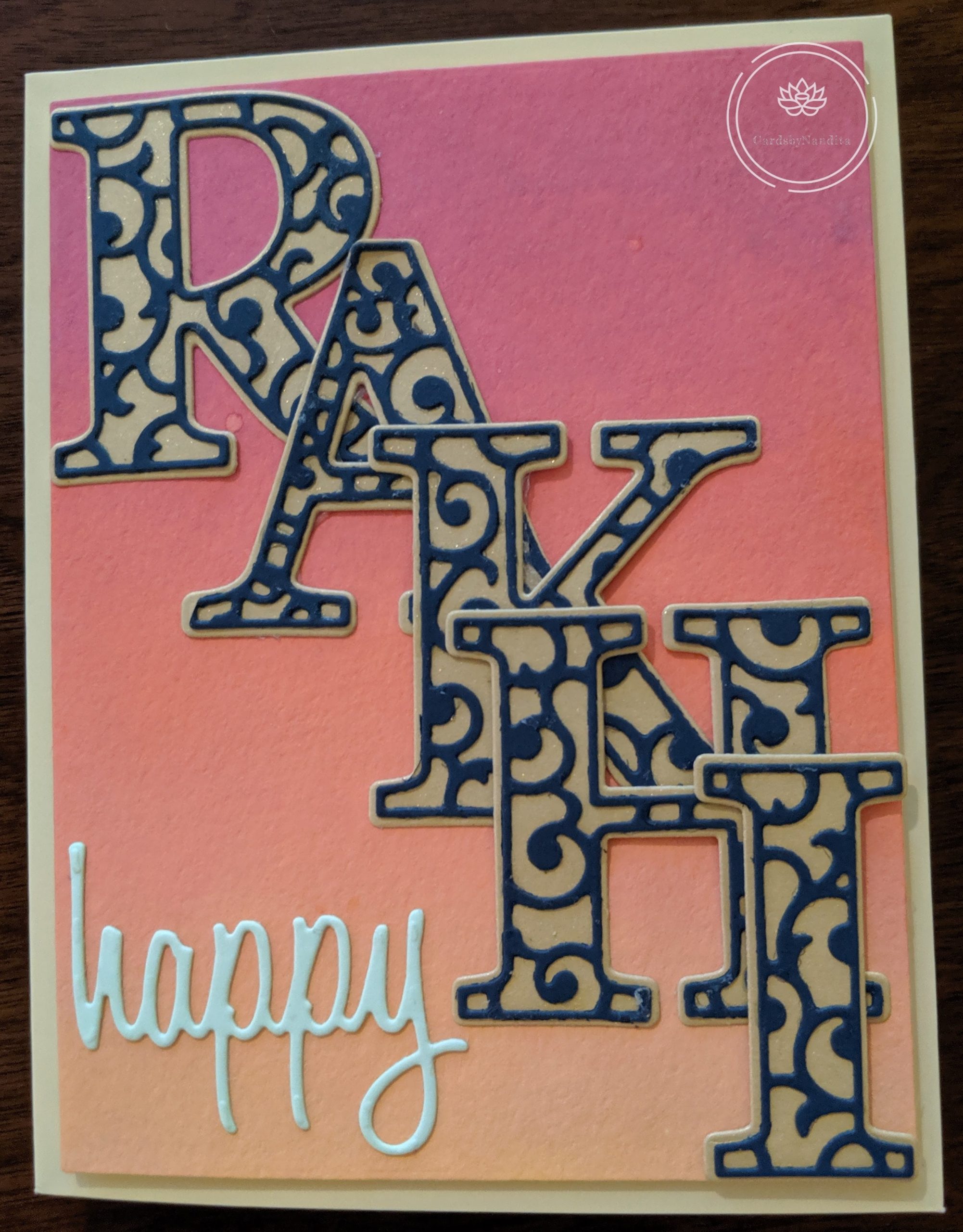 During late summer/early fall, when I would normally make my rakhi cards, I was right in the thick of my house search. Luckily, I still had ink blended backgrounds leftover from a few months earlier and was able to use them for quick rakhi cards. For sentiments, I went with Card Making Magic filigree letters since I could customize the greeting easily. I even ended up with a couple extra cards that I added to my stash.